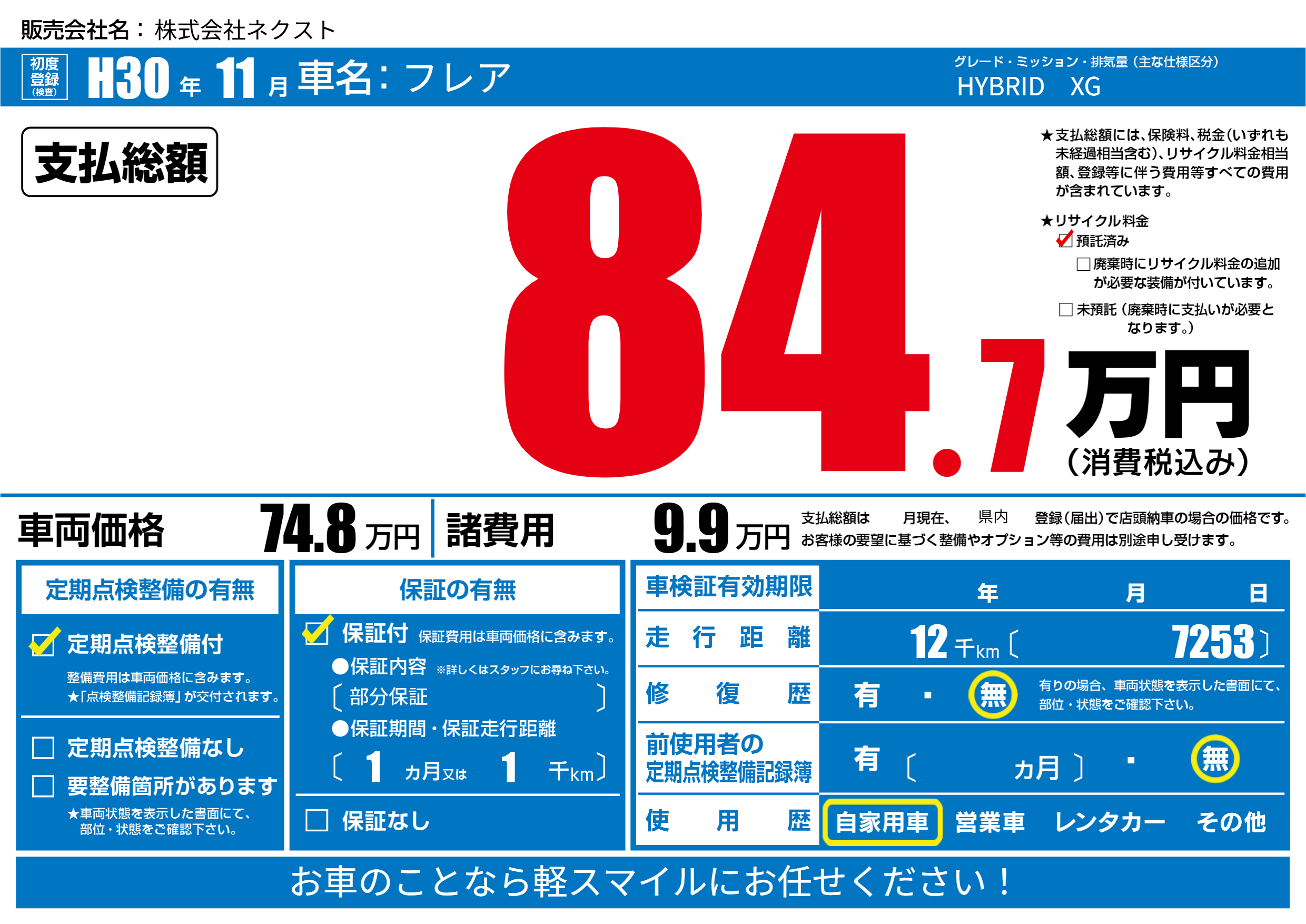| 走行キロ | 1.2万km | 初年度登録 | H30年11月 |