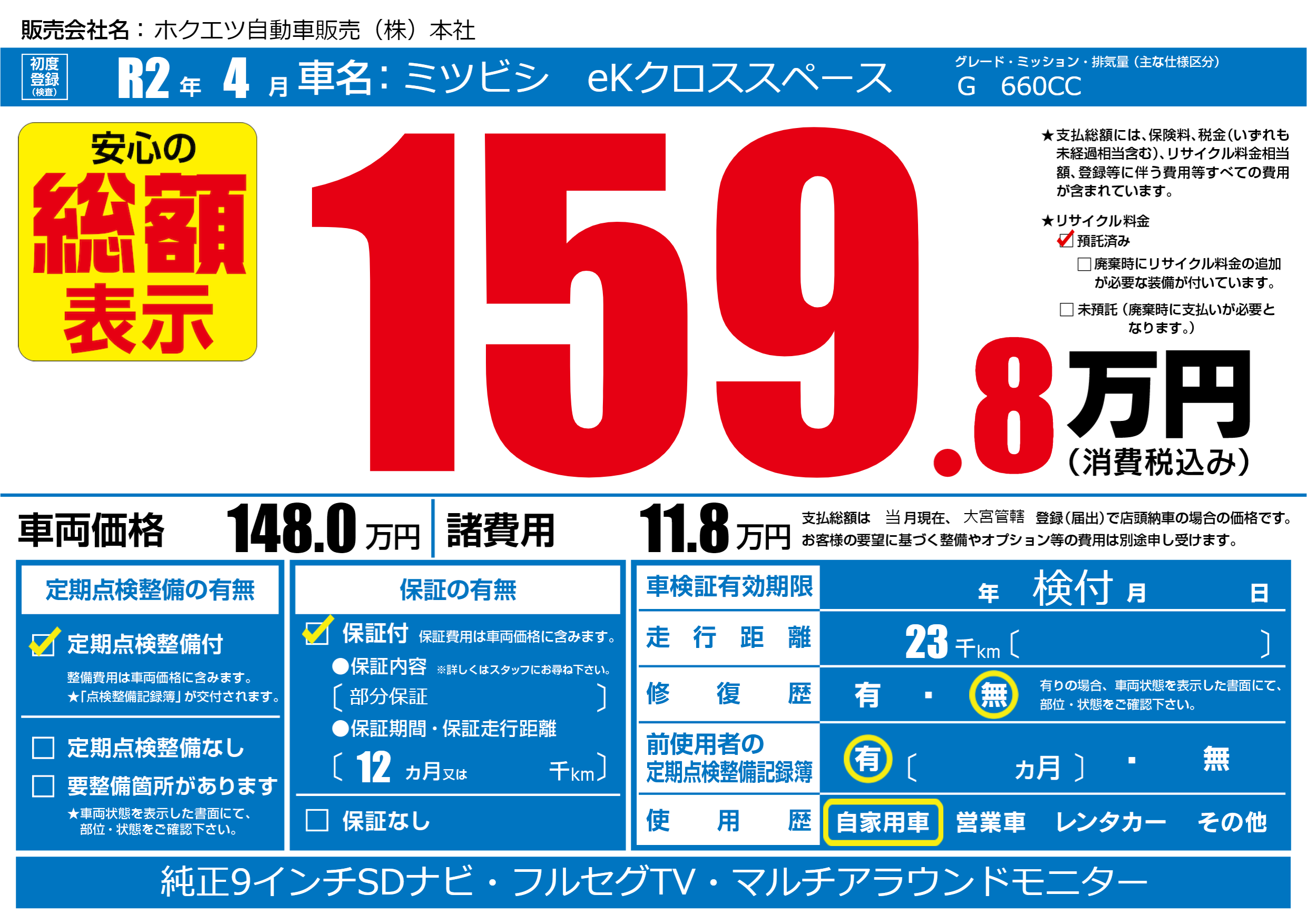 | 車名 | ミツビシ eKクロススペース | グレード ミッション 排気量 |