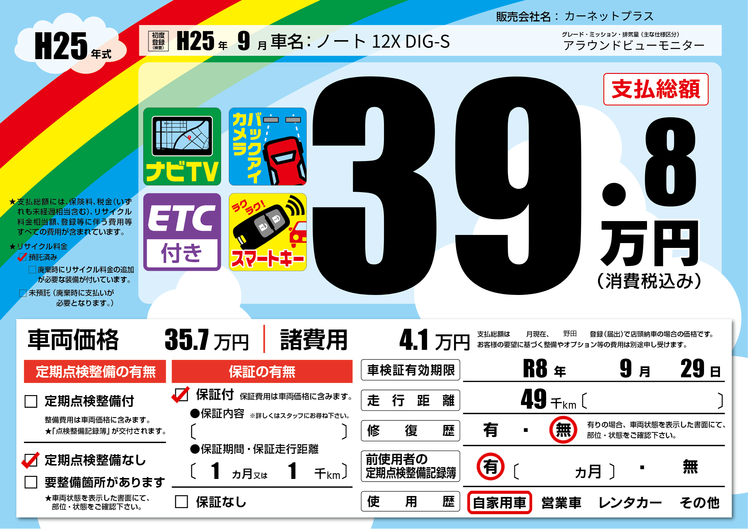 | 走行キロ | 4.9万km | 初年度登録 | H25年9月 |