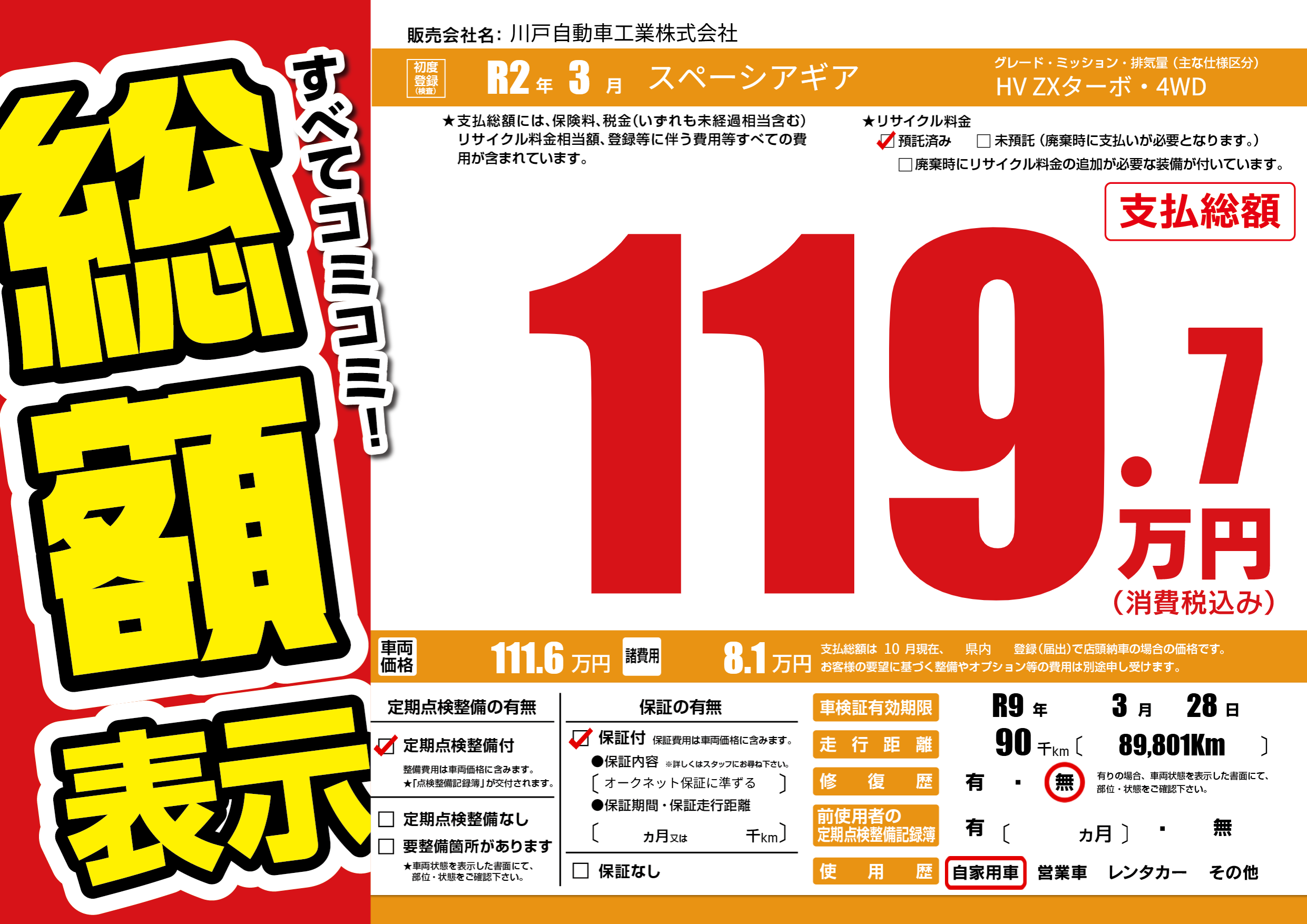 | 走行キロ | 9万km | 初年度登録 | R2年3月 |