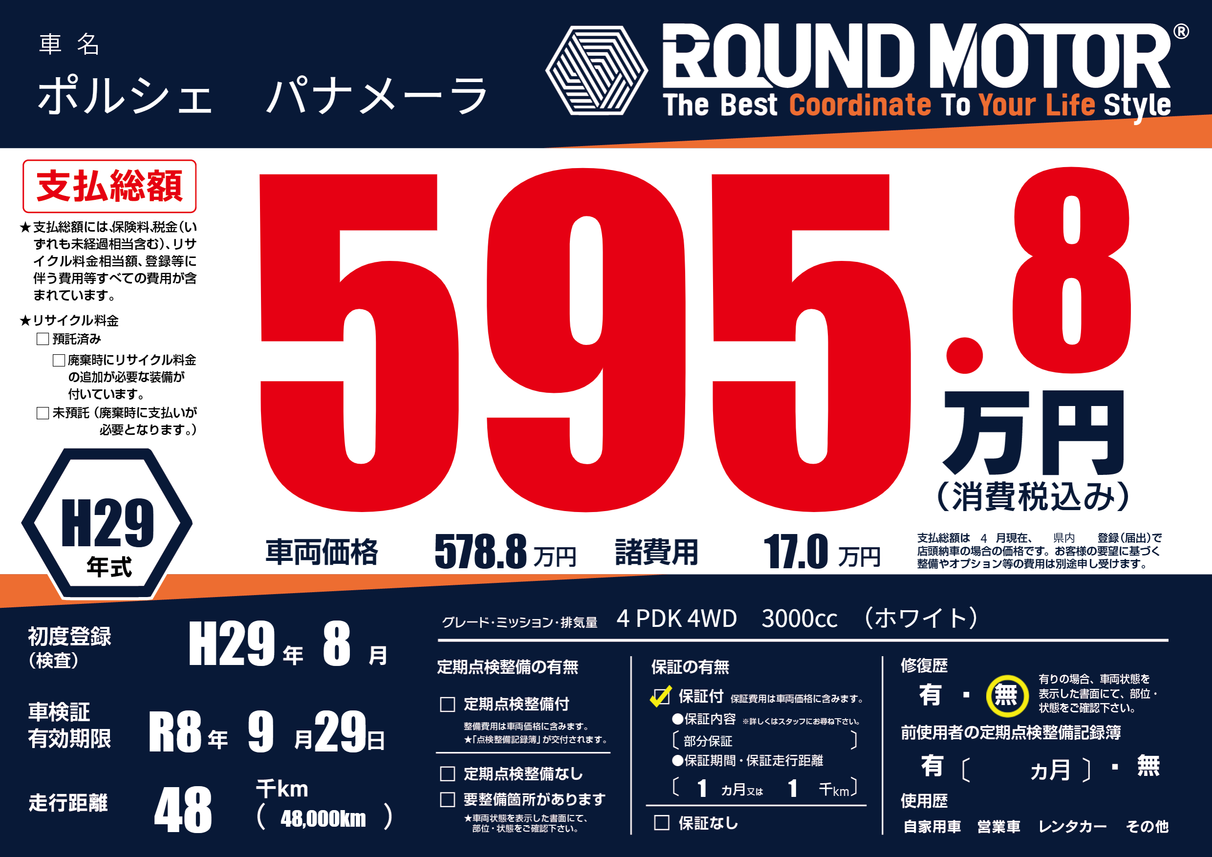 | 走行キロ | 4.8万km | 初年度登録 | H29年8月 |