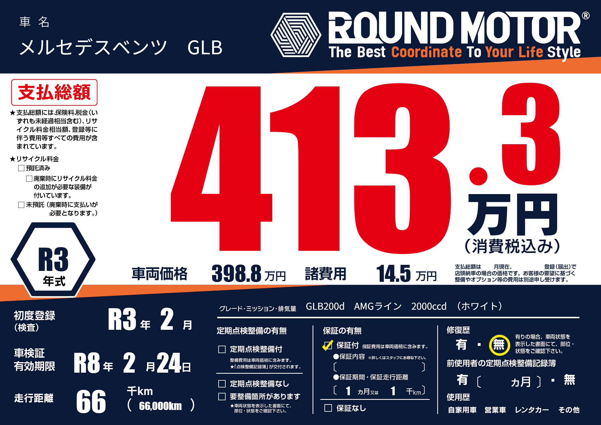 | 車名 | メルセデスベンツ GLB | グレード ミッション 排気量 |