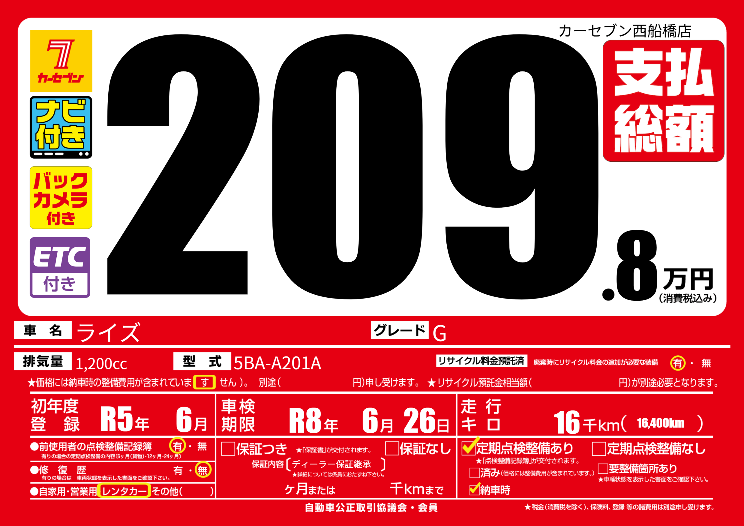 | 走行キロ | 1.6万km | 初年度登録 | R5年6月 |