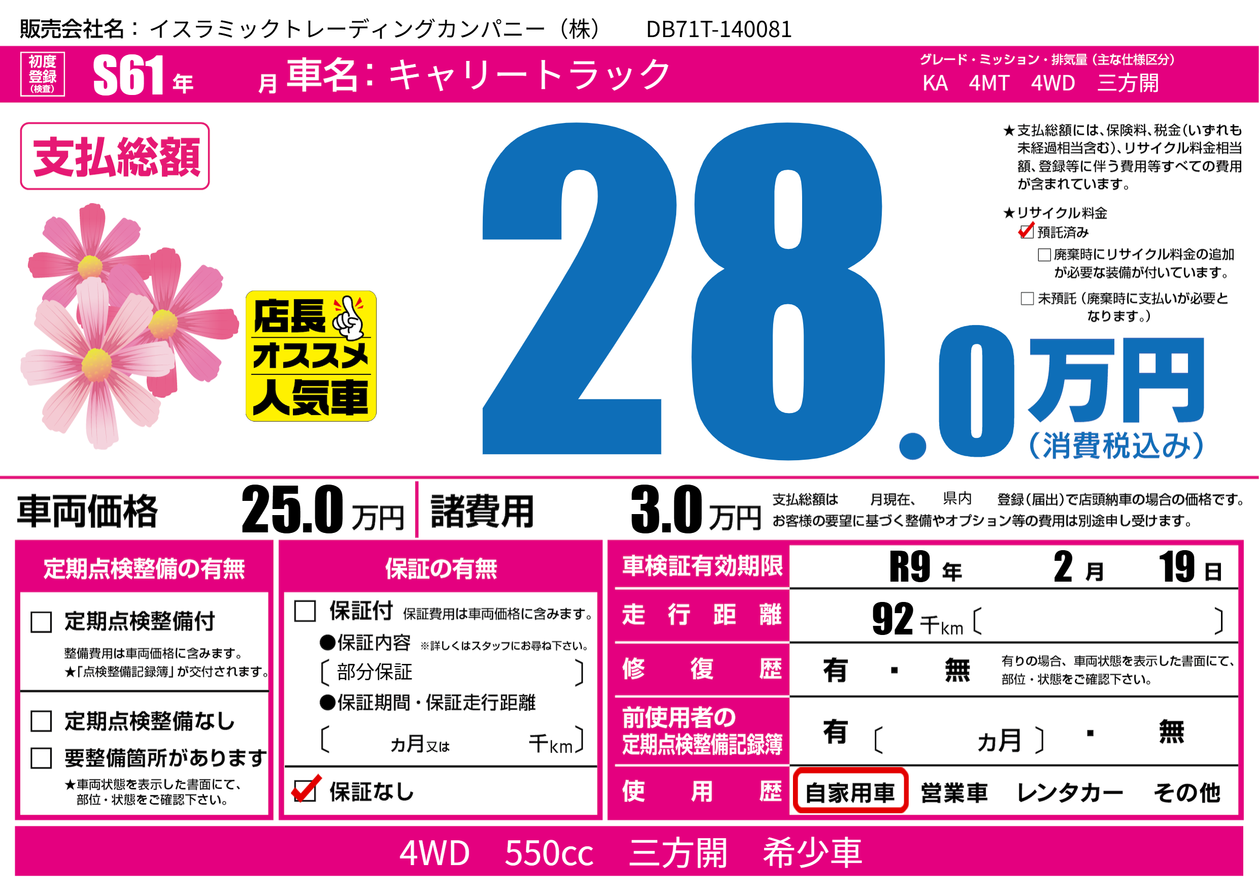 | 車名 | キャリートラック | グレード ミッション 排気量 |