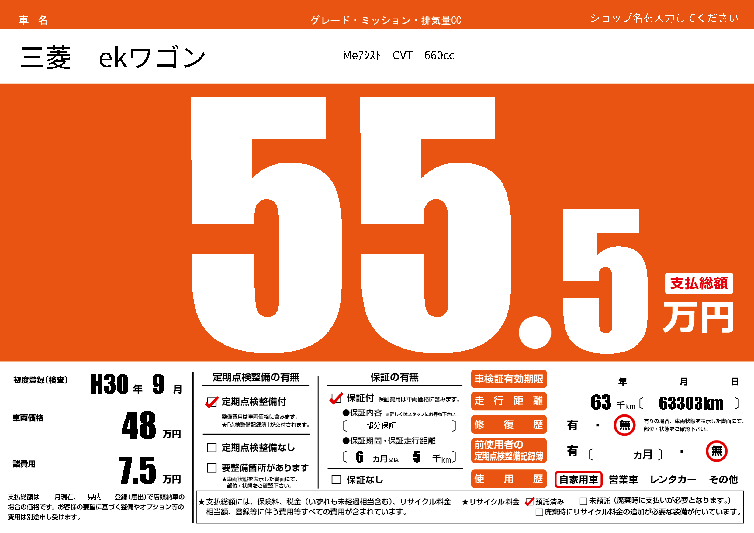 | 車名 | 三菱 ekワゴン | グレード ミッション 排気量 |