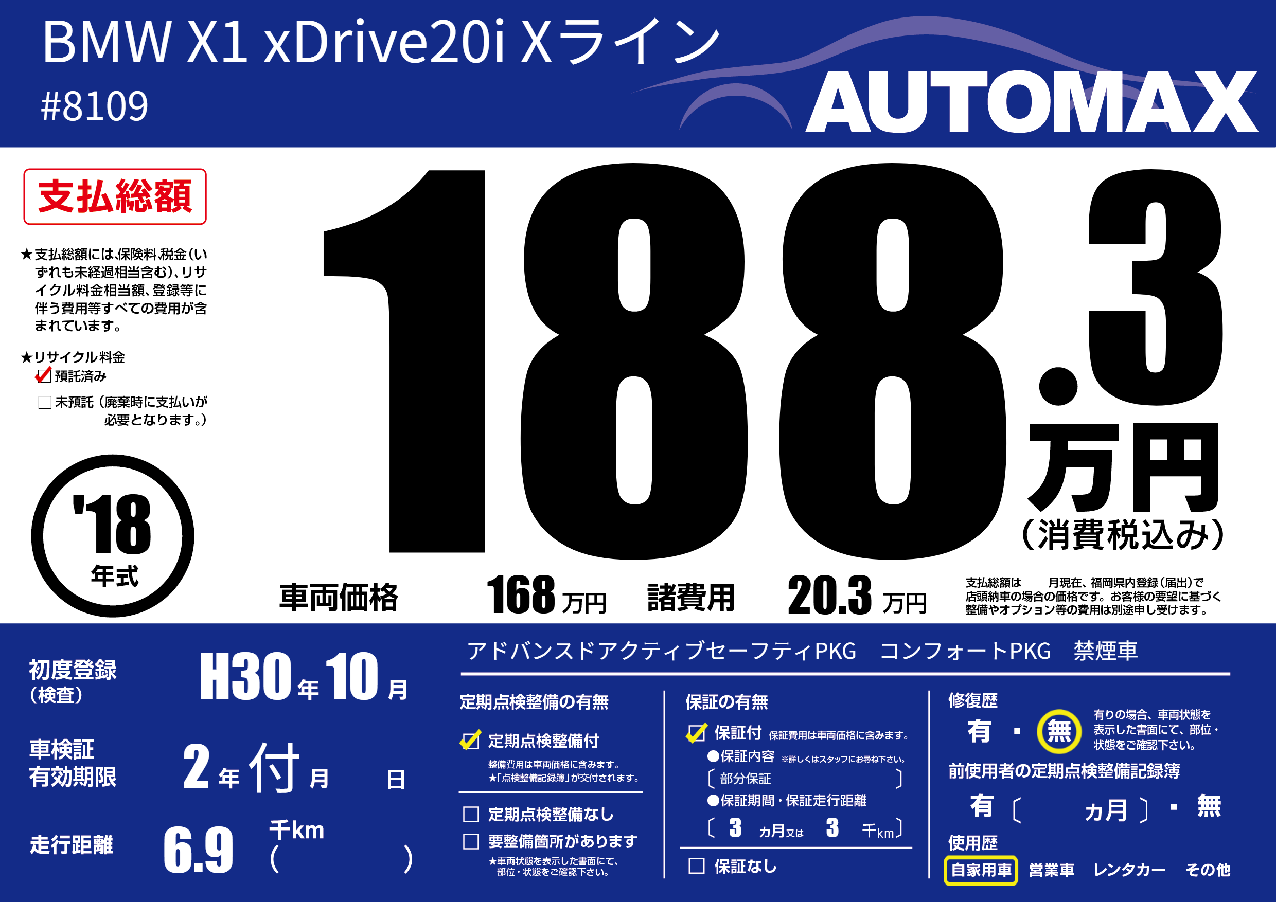 | 車名 | BMW X1 xDrive20i Xライン | グレード ミッション 排気量 |