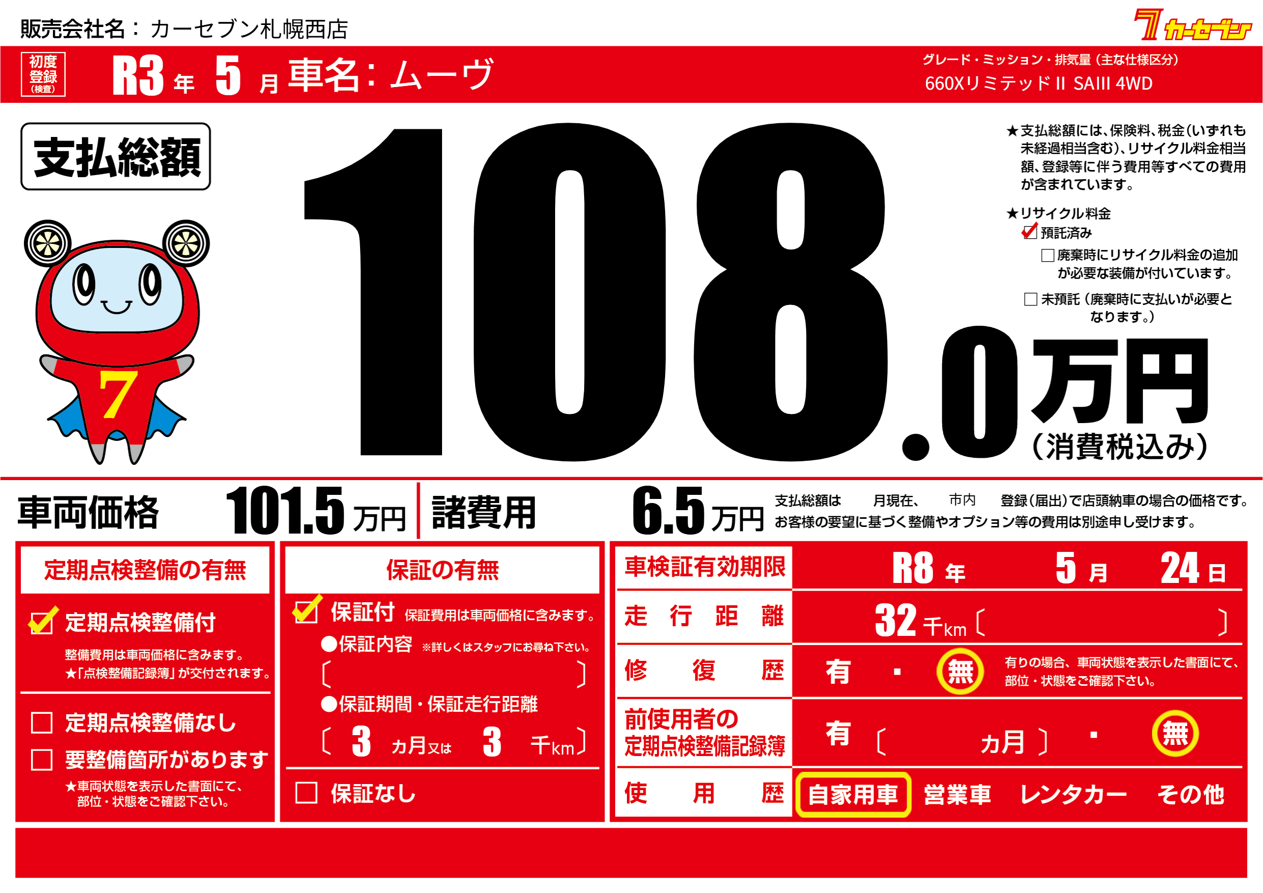 保証付き 保証内容(---) 3ヶ月または(3)千kmまで |
