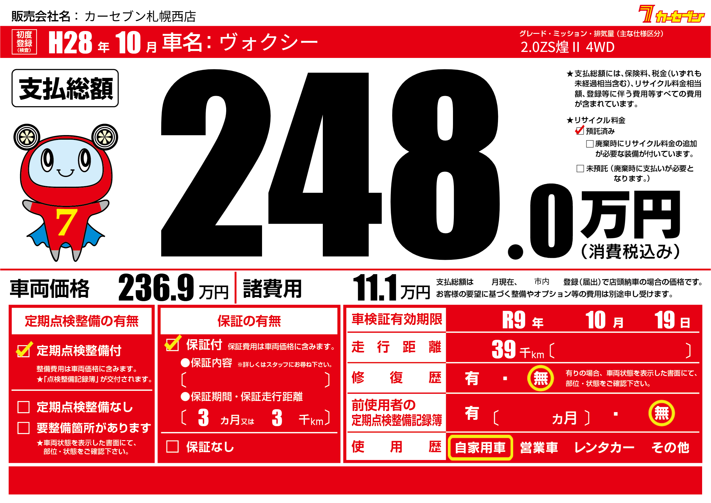 | 走行キロ | 3.9万km | 初年度登録 | H28年10月 |