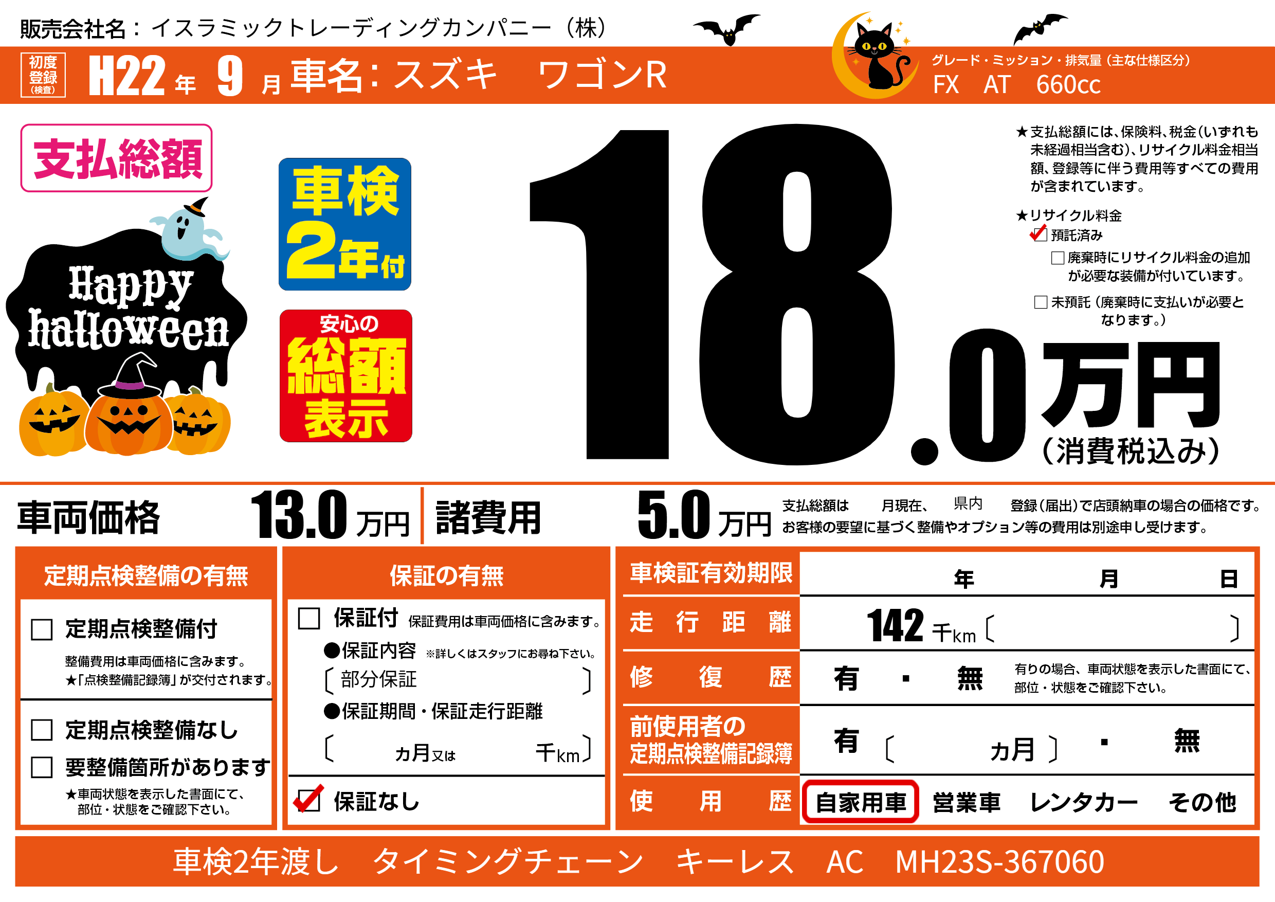 | 走行キロ | 14.2万km | 初年度登録 | H22年9月 |
