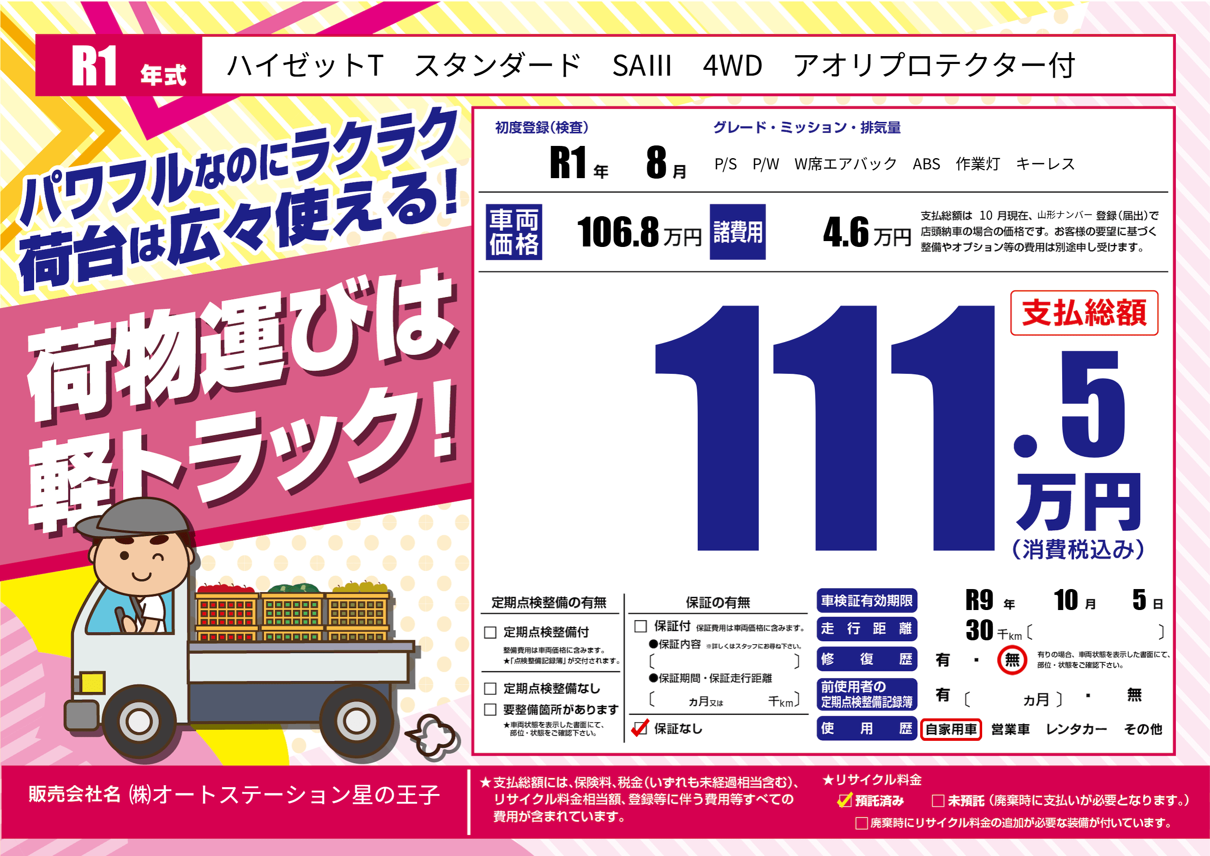 | 車名 | ハイゼットT スタンダード SAⅢ 4WD アオリプロテクター付 | グレード ミッション 排気量 |