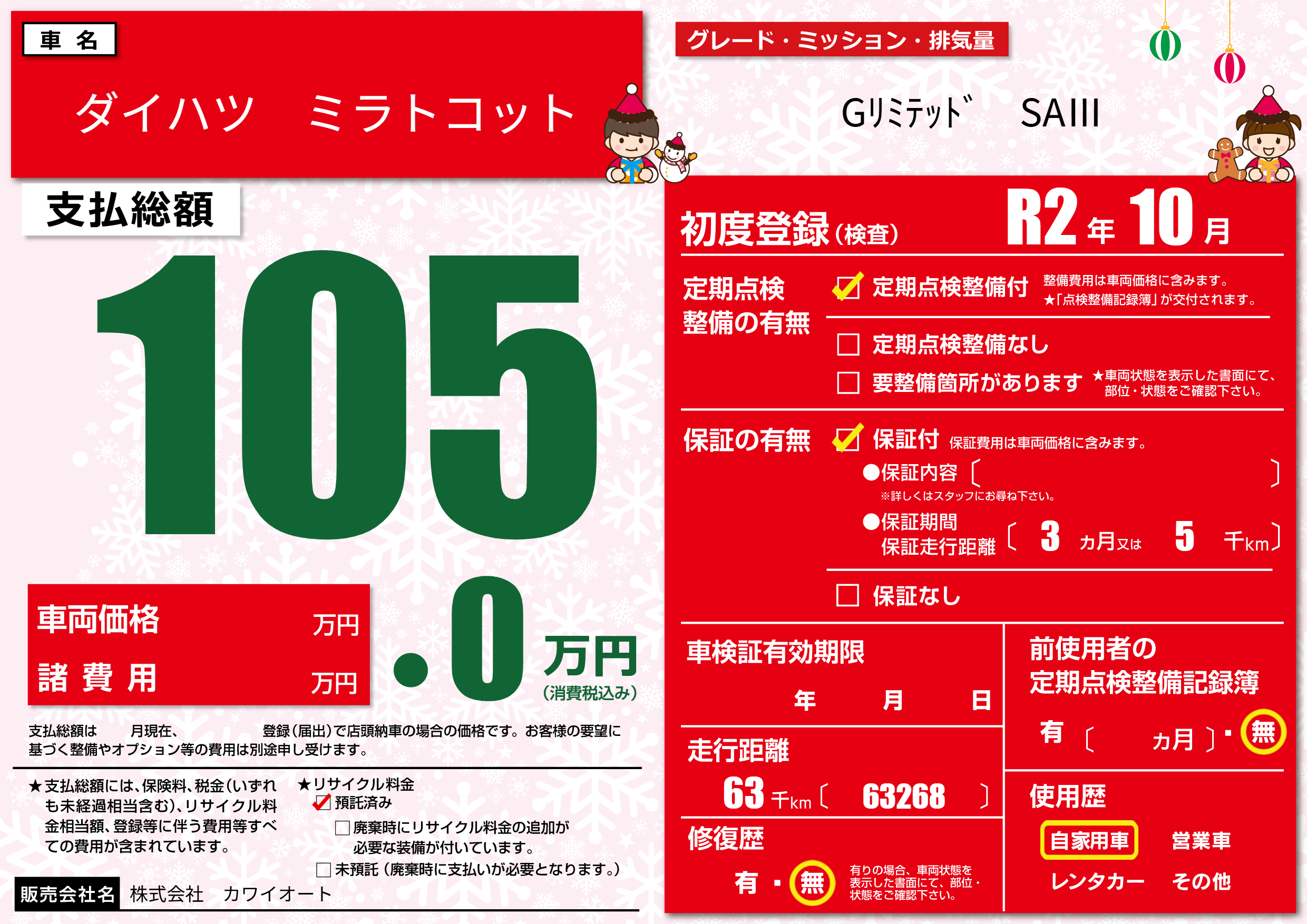 | 車名 | ダイハツ ミラトコット | グレード ミッション 排気量 |