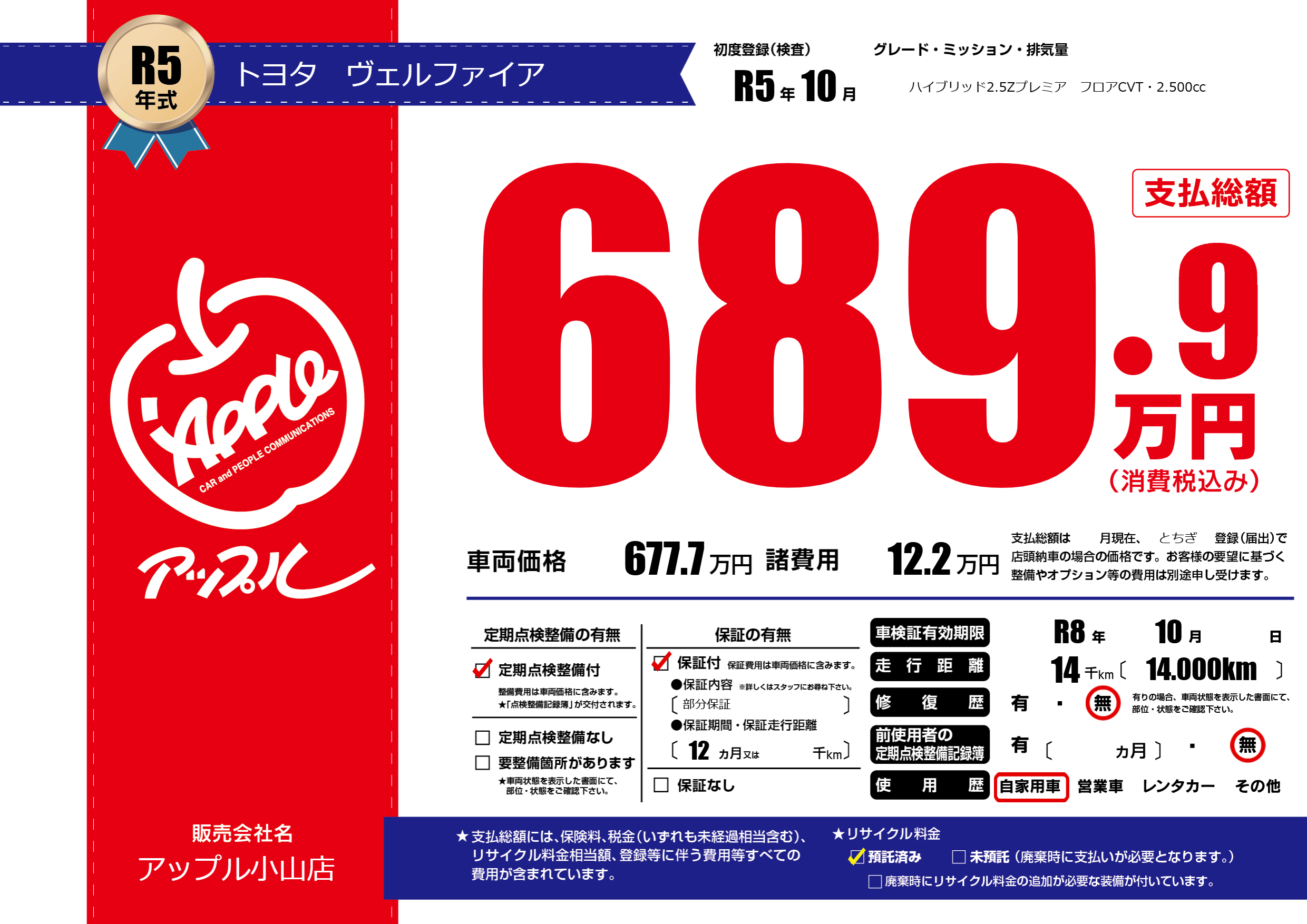 | リサイクル料金 預託済 |