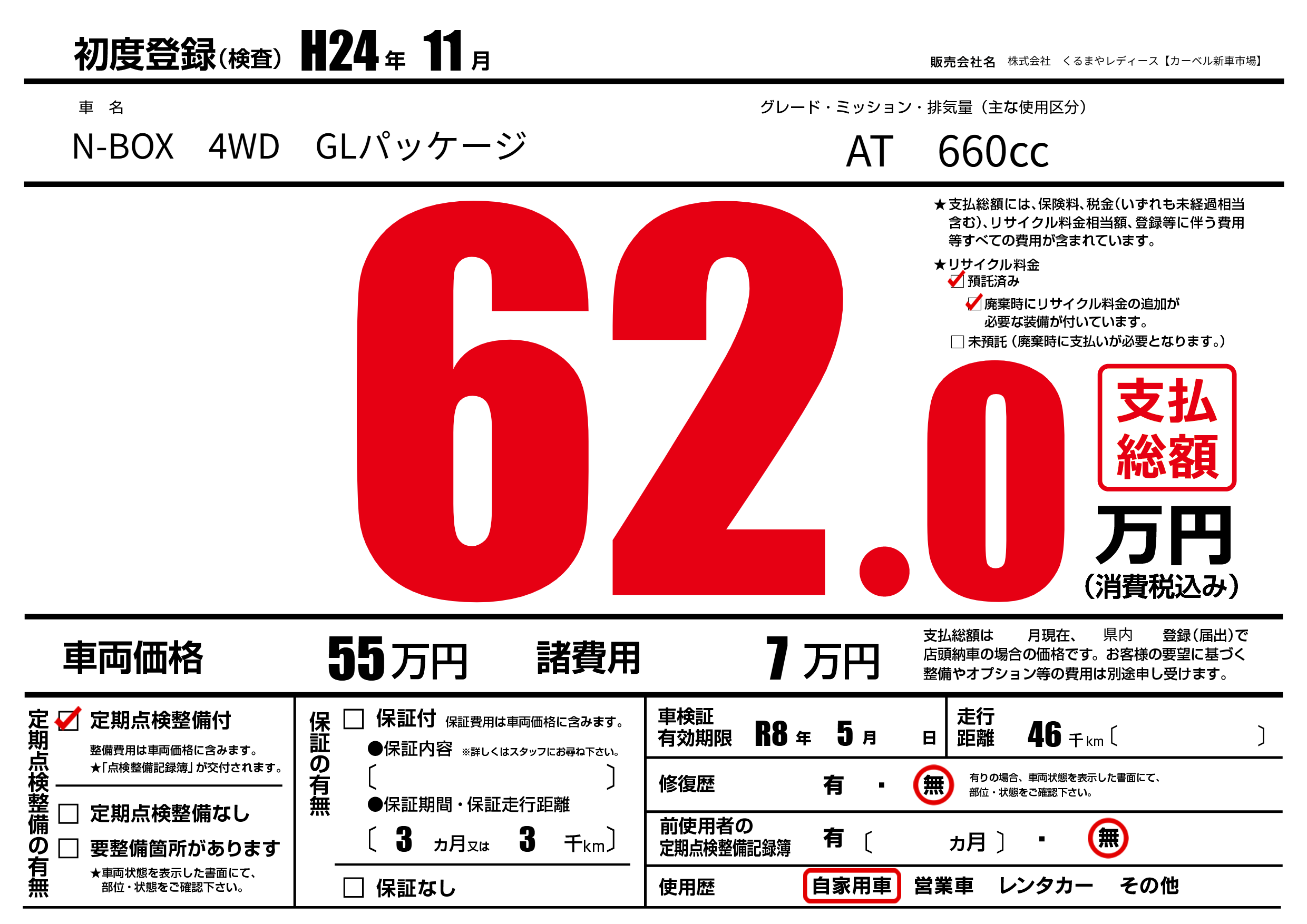 | 車名 | N-BOX 4WD GLパッケージ | グレード ミッション 排気量 |