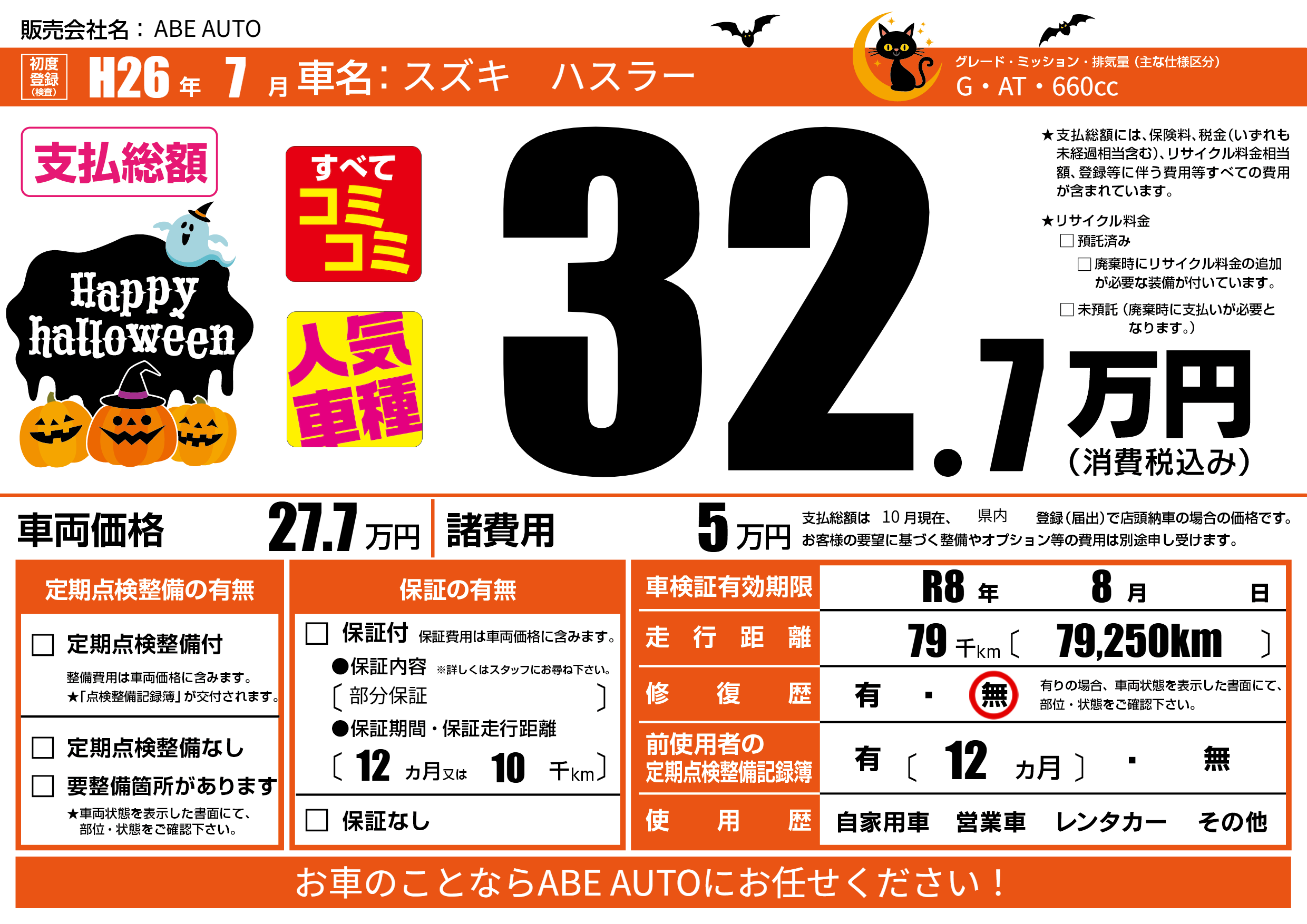| 車名 | スズキ ハスラー | グレード ミッション 排気量 |
