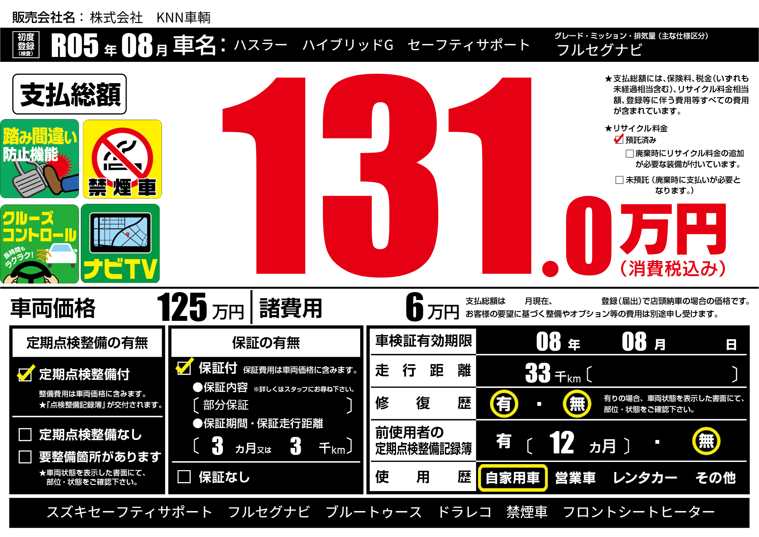 | 車名 | ハスラー ハイブリッドG セーフティサポート | グレード ミッション 排気量 |