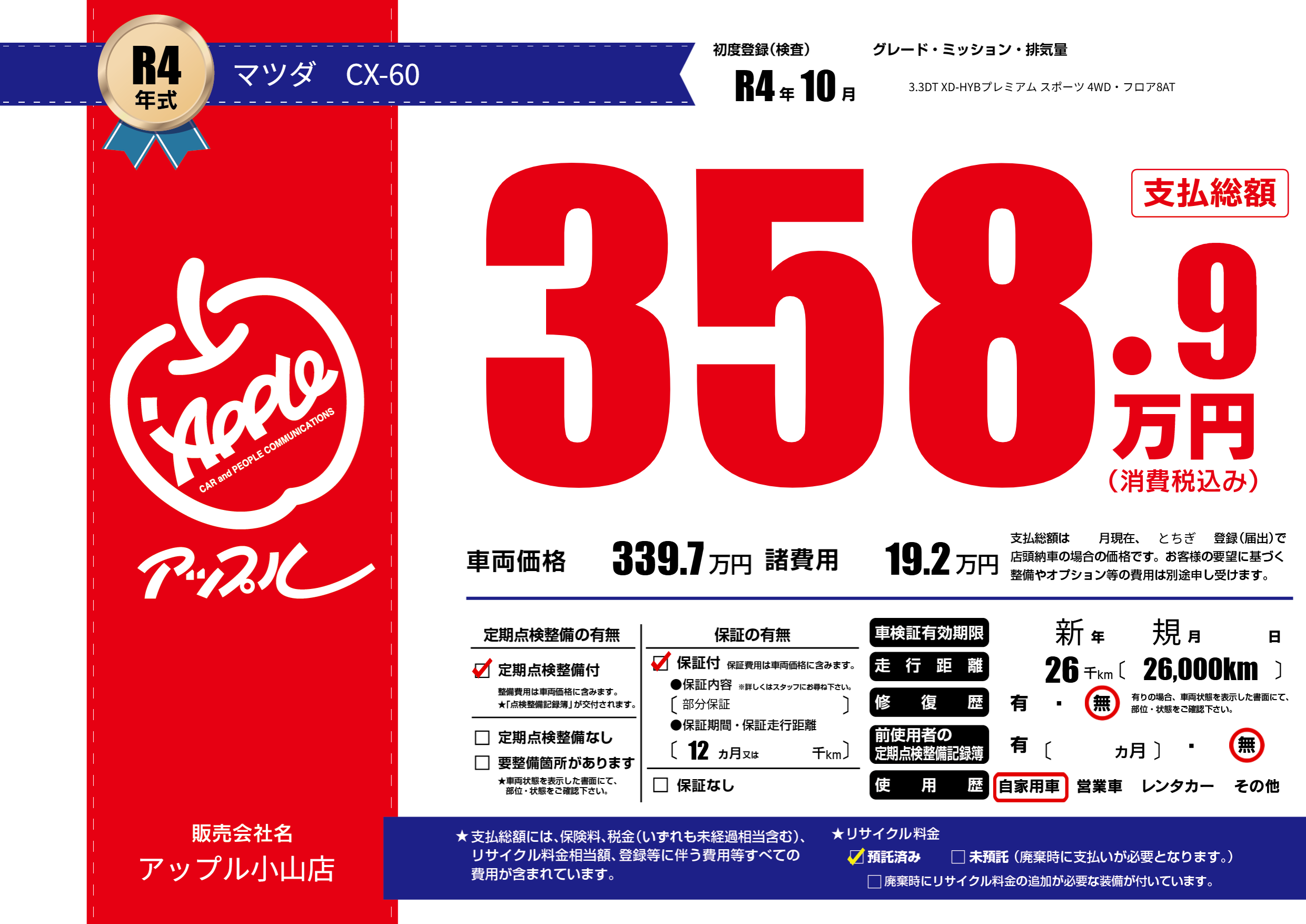 | 車名 | マツダ CX-60 | グレード ミッション 排気量 |