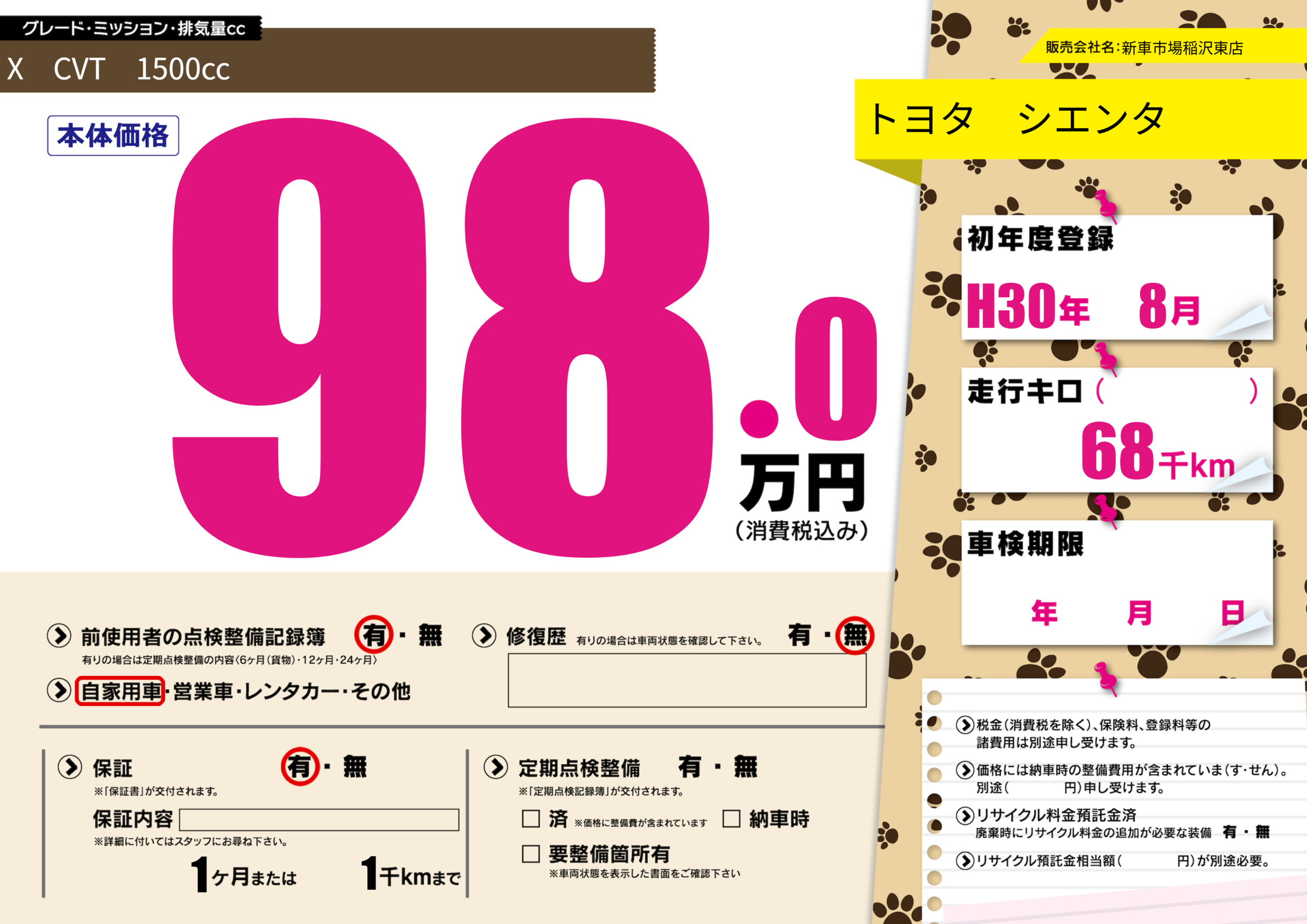 | 車名 | トヨタ シエンタ | グレード ミッション 排気量 |