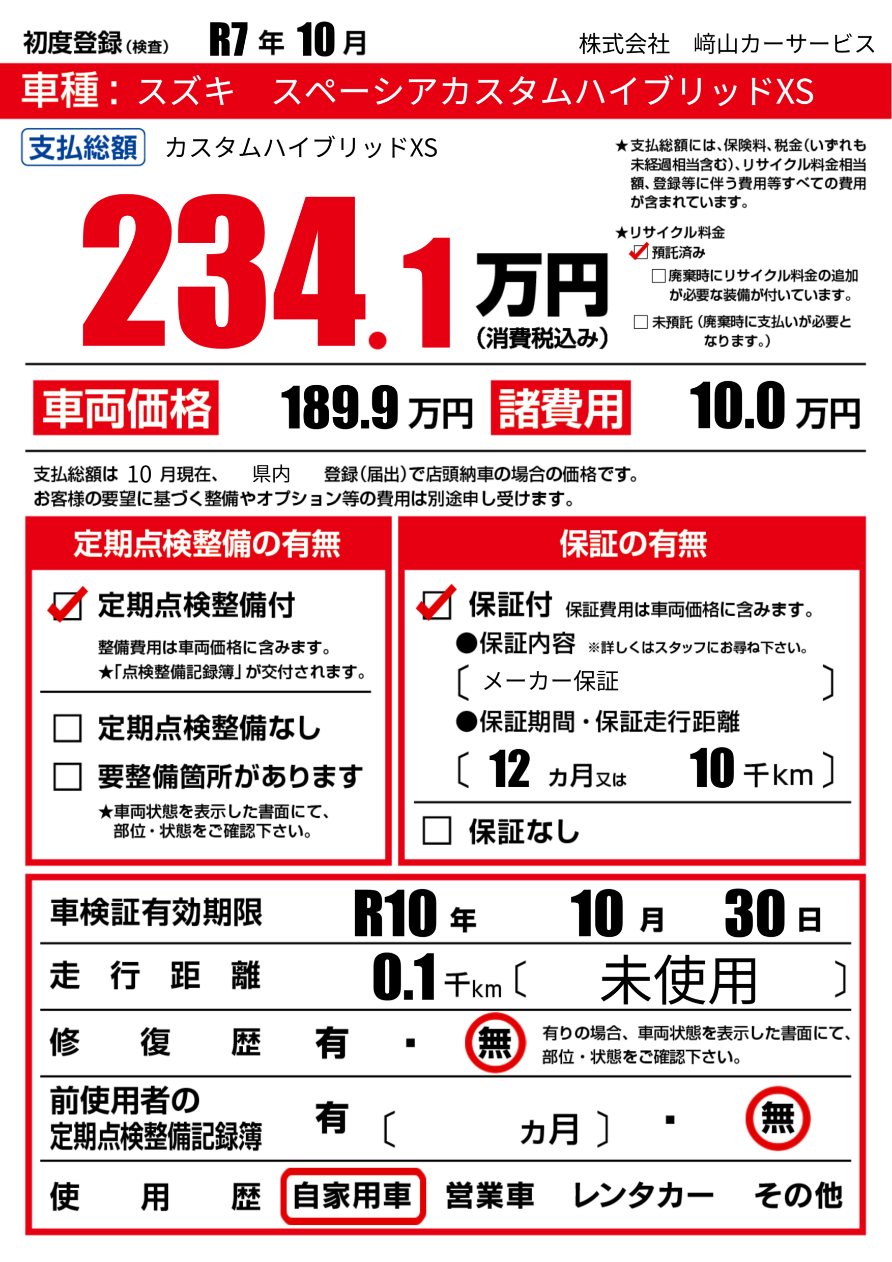 | 走行キロ | - | 初年度登録 | R7年10月 |
