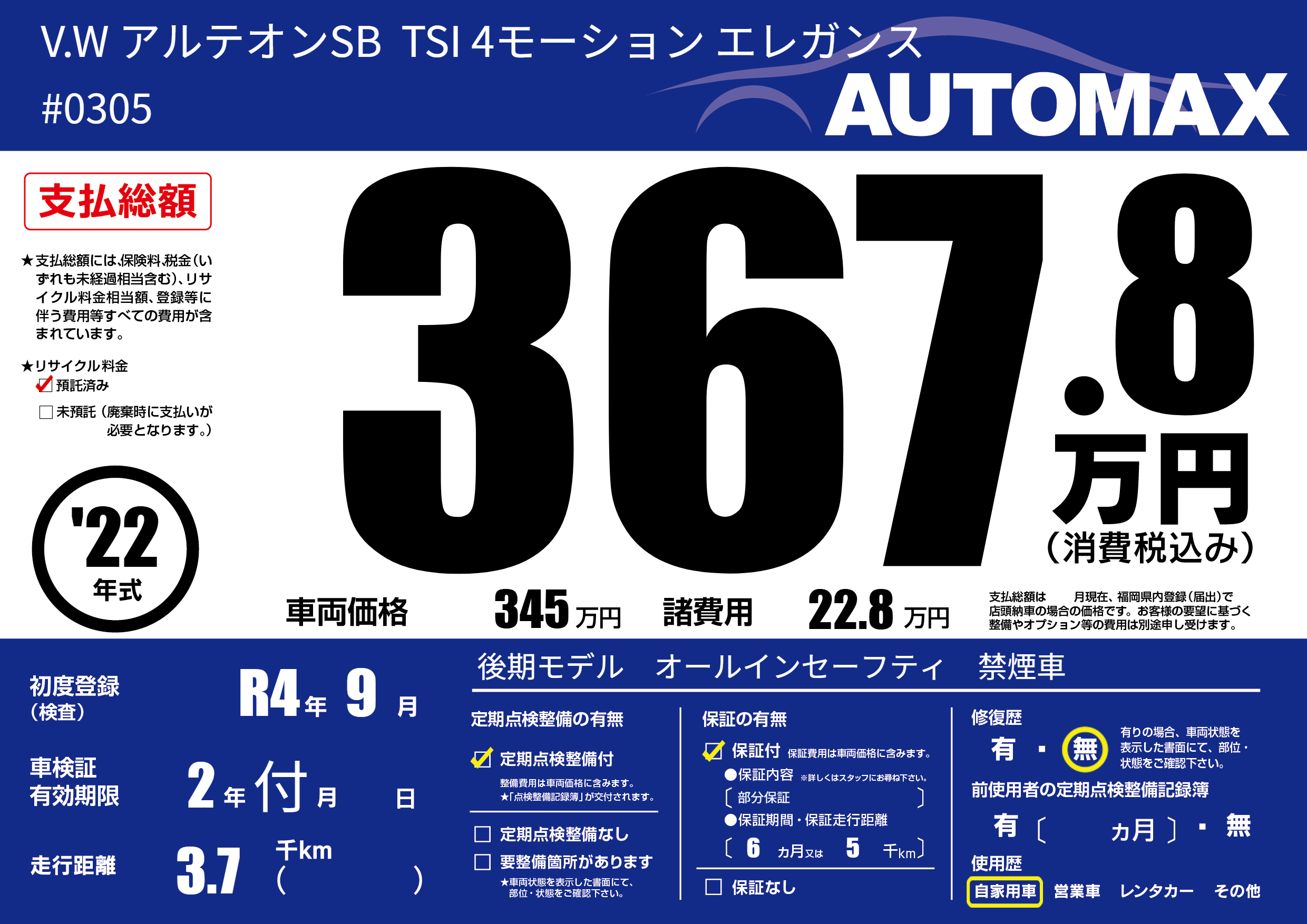 | 走行キロ | 0.3万km | 初年度登録 | R4年9月 |
