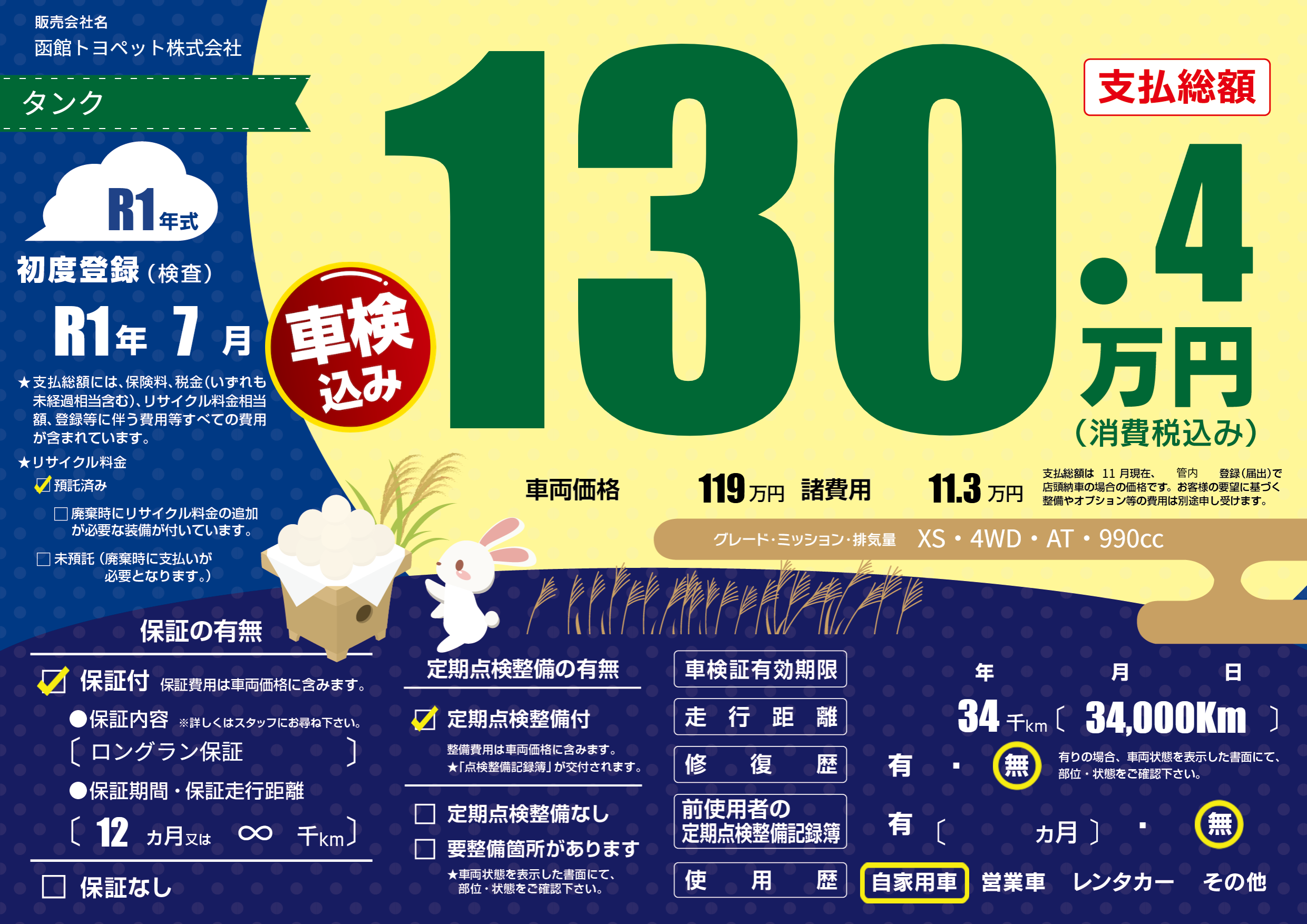 | 走行キロ | 3.4万km | 初年度登録 | R1年7月 |