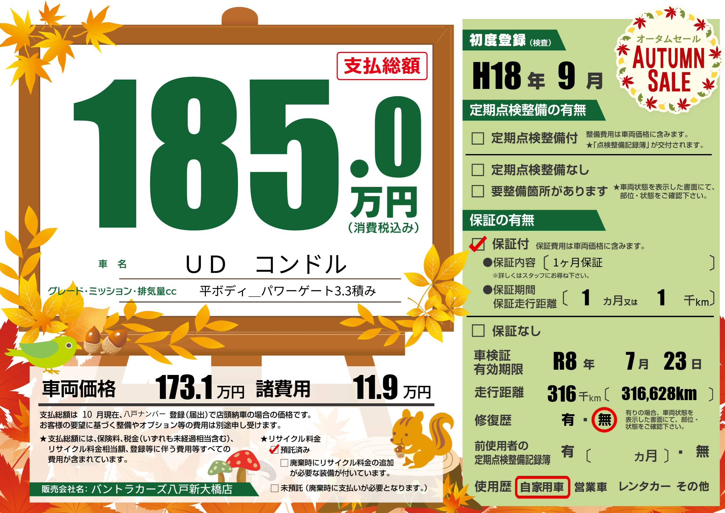 | 走行キロ | 31.6万km | 初年度登録 | H18年9月 |