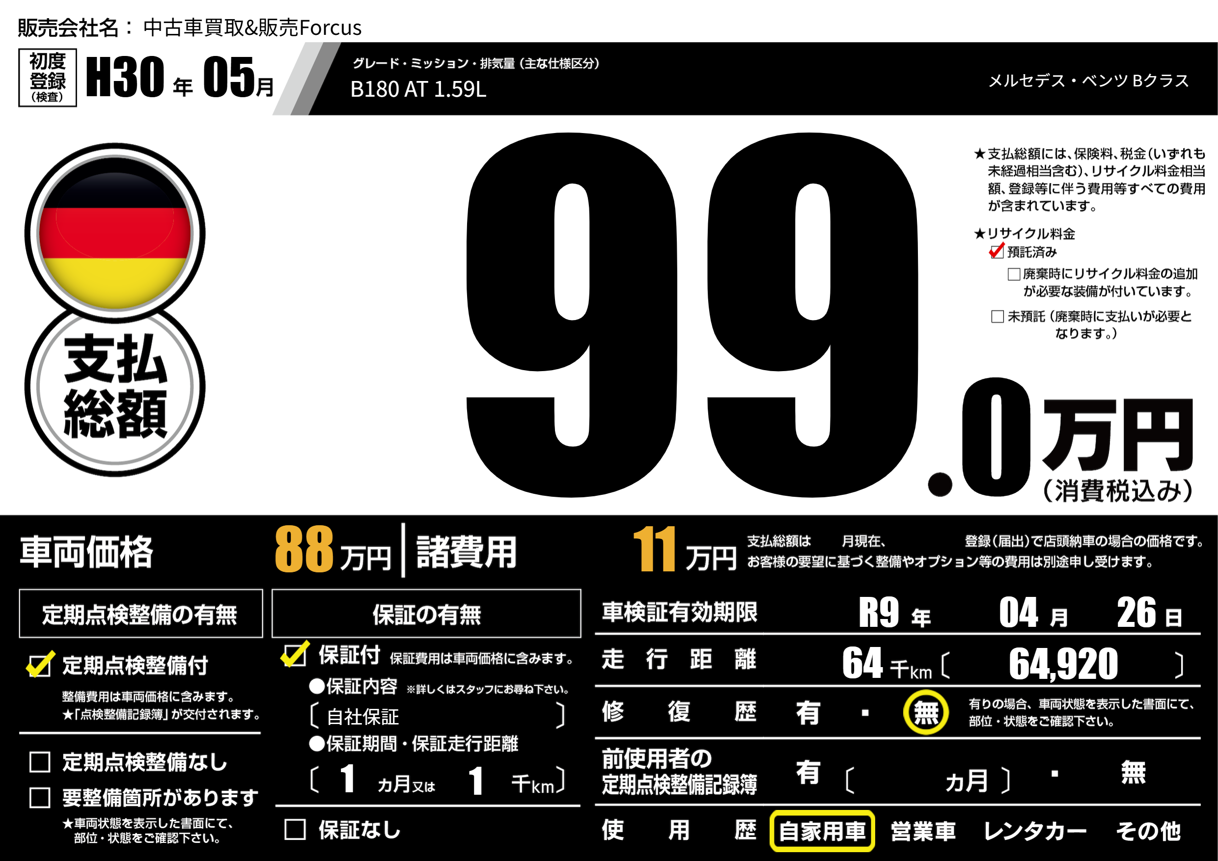 | 車名 | メルセデス・ベンツ Bクラス | グレード ミッション 排気量 |
