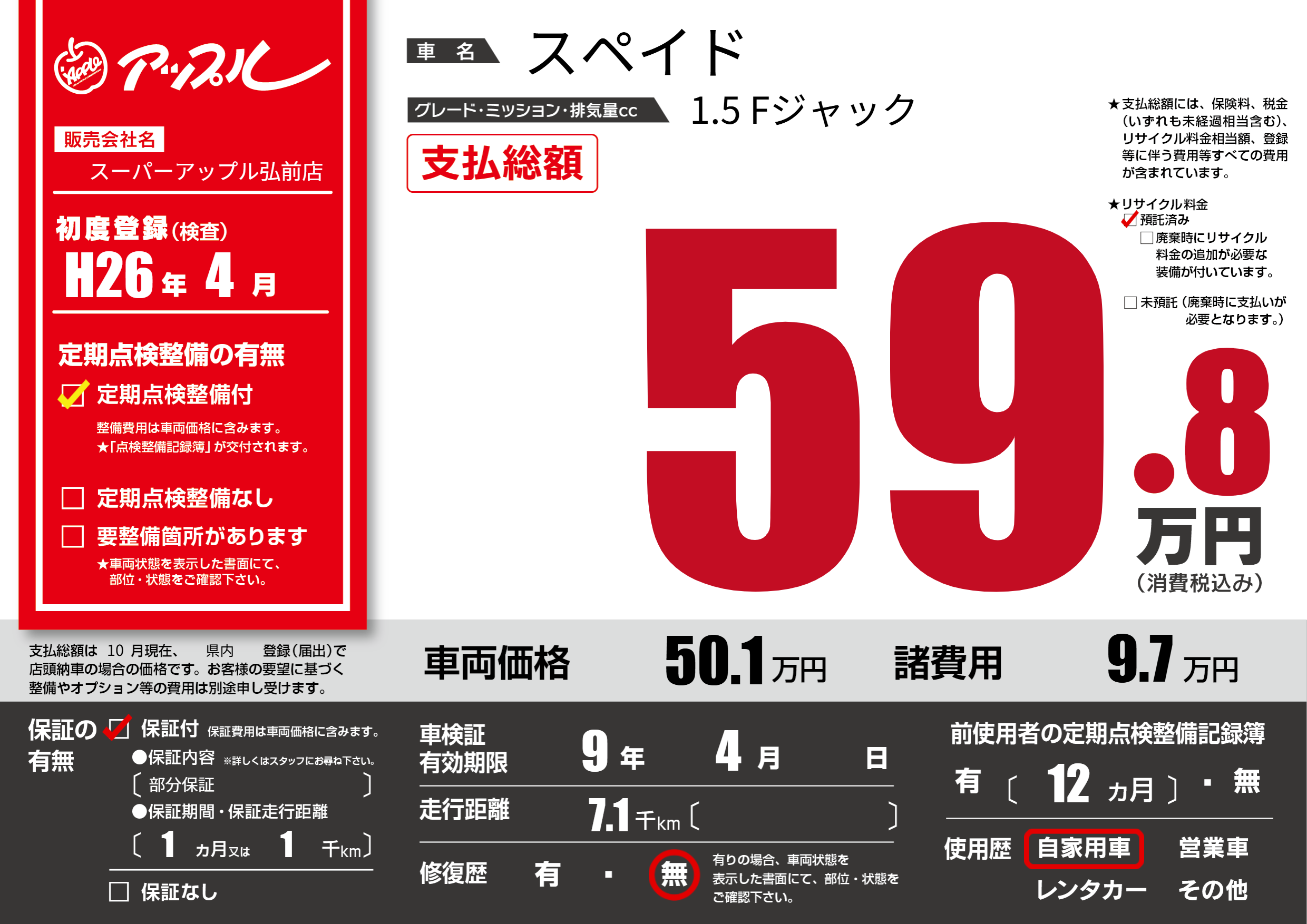 | 車名 | スペイド | グレード ミッション 排気量 |
