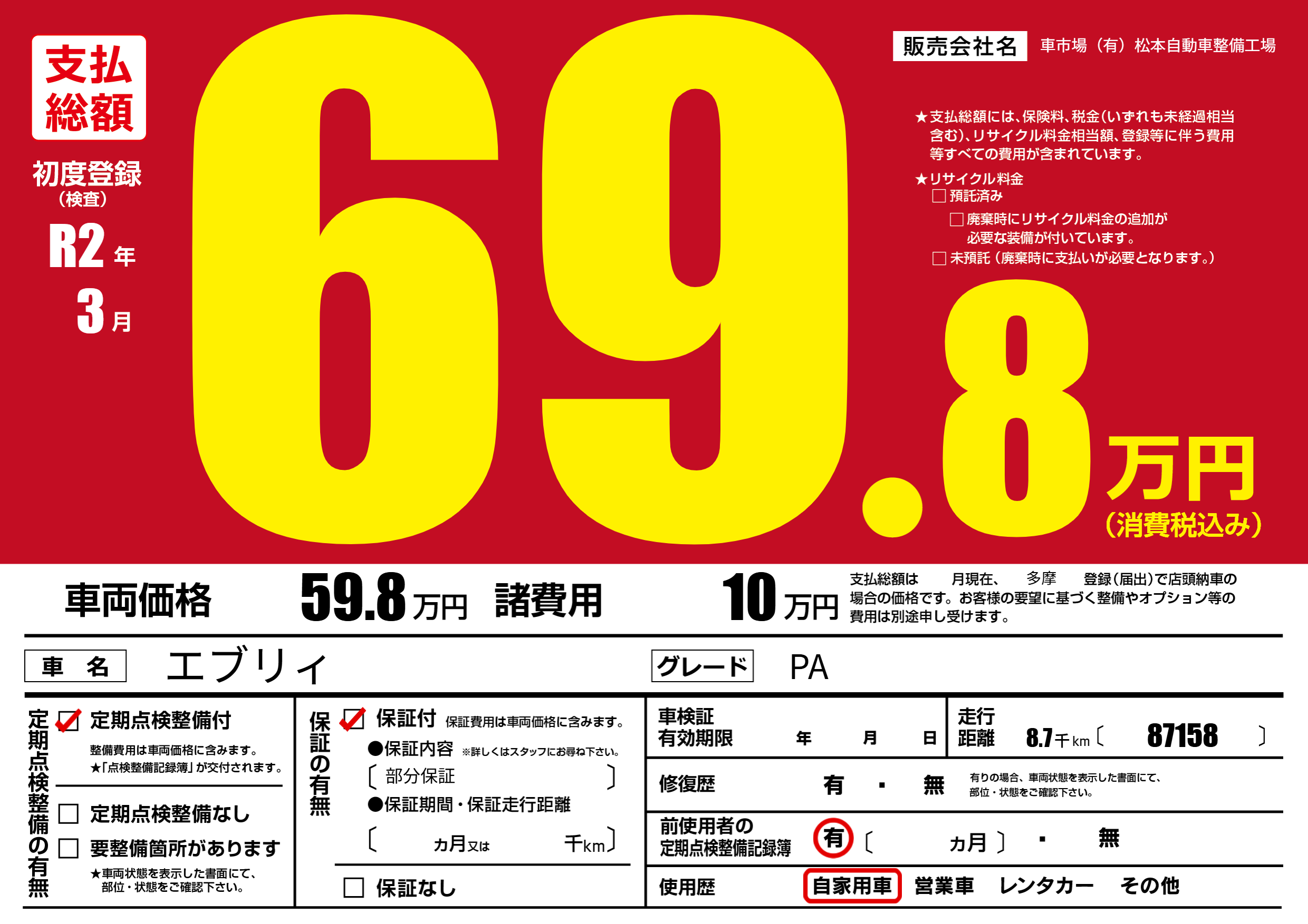 | 走行キロ | 0.8万km | 初年度登録 | R2年3月 |