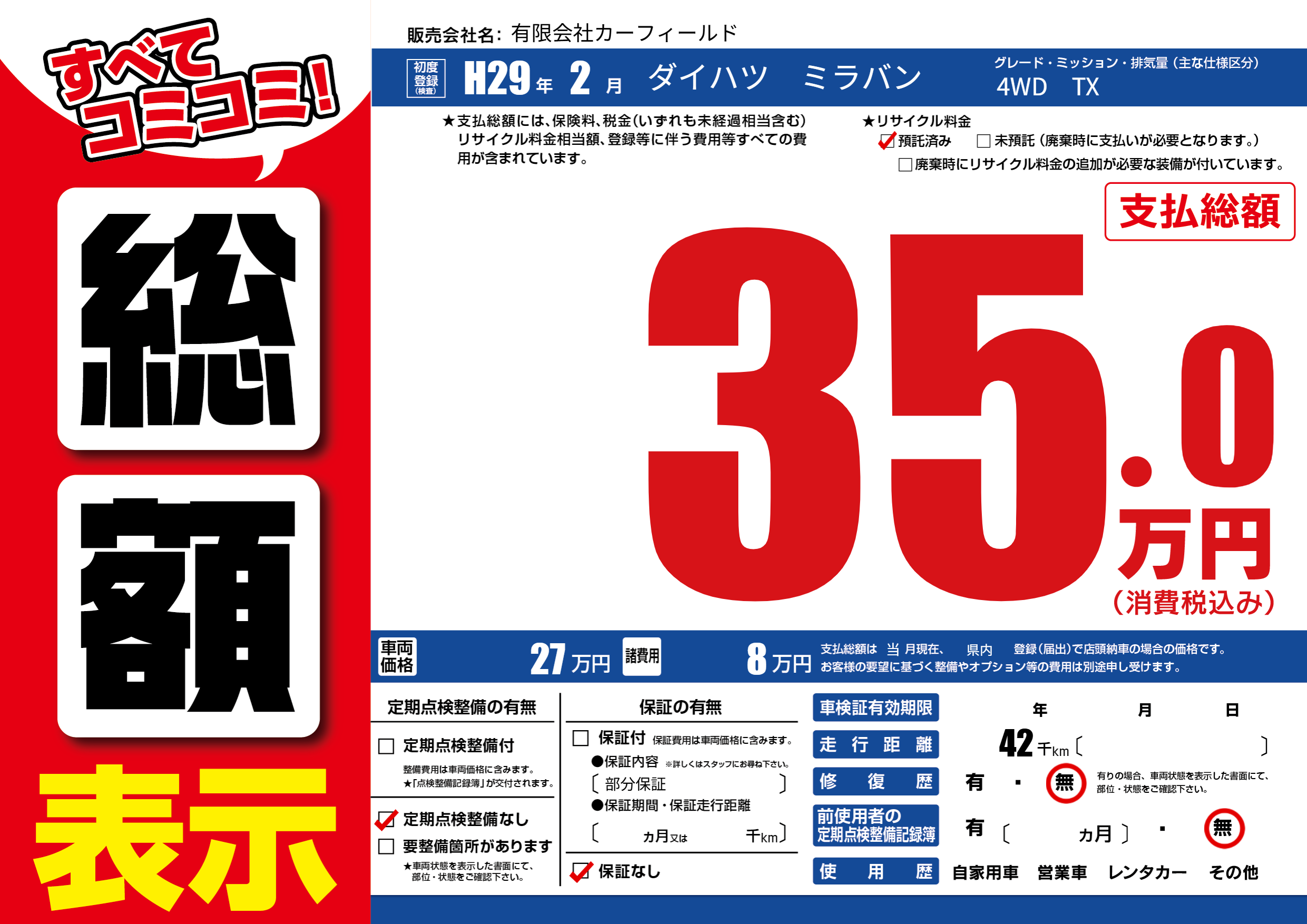 | 走行キロ | 4.2万km | 初年度登録 | H29年2月 |