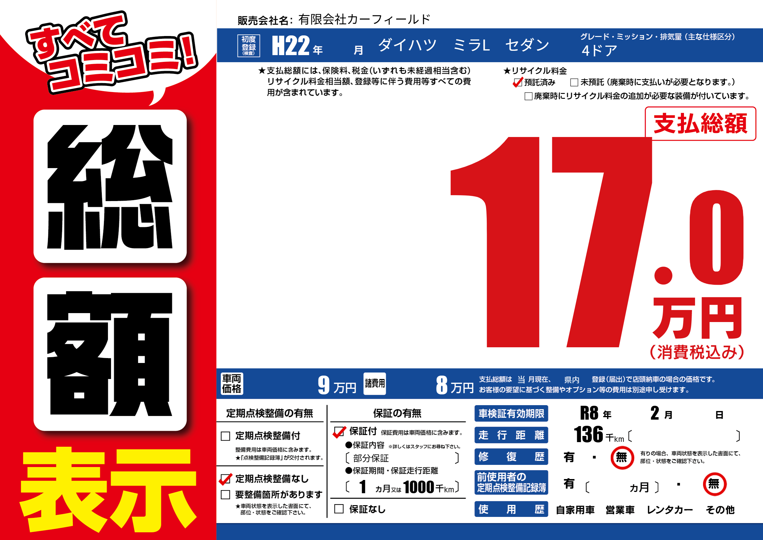 保証付き 保証内容(部分保証) 1ヶ月または(1000)千kmまで |