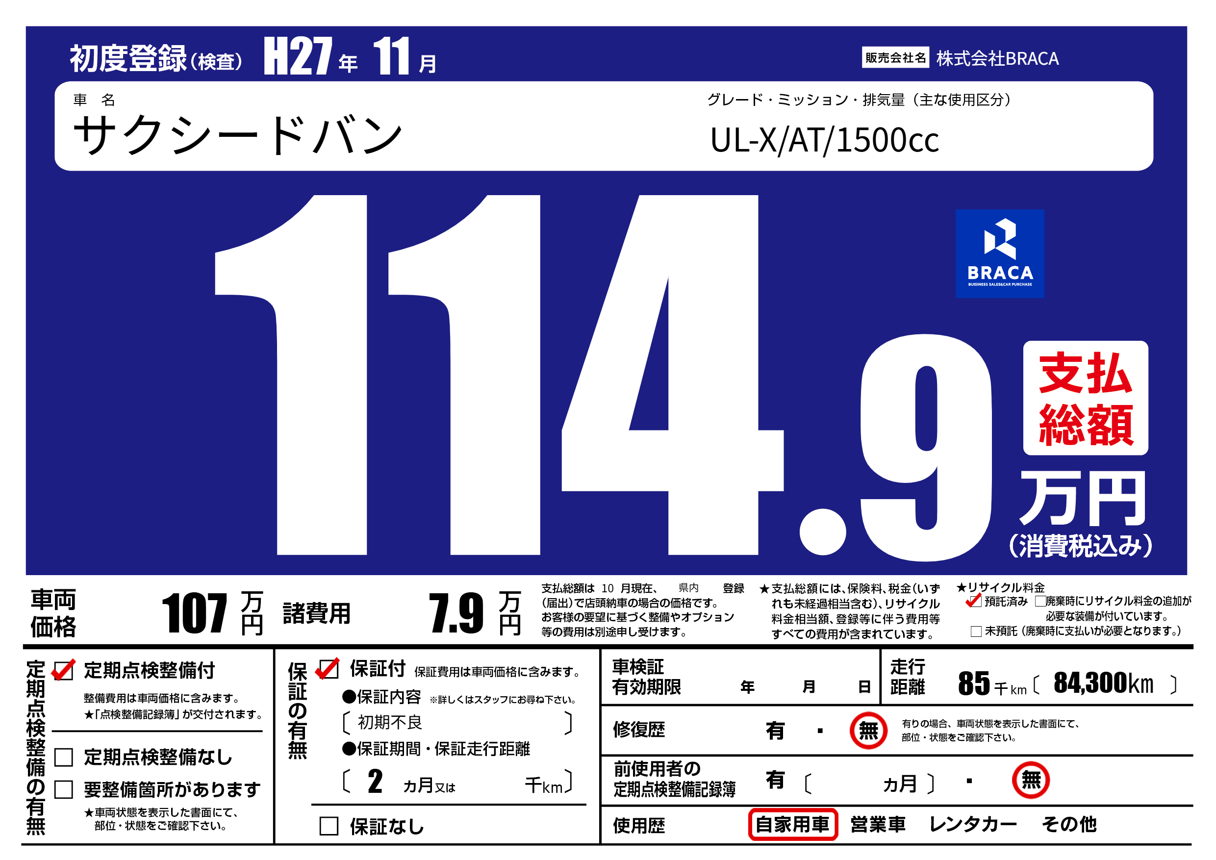 | 初年度登録 | H27年11月 | ||