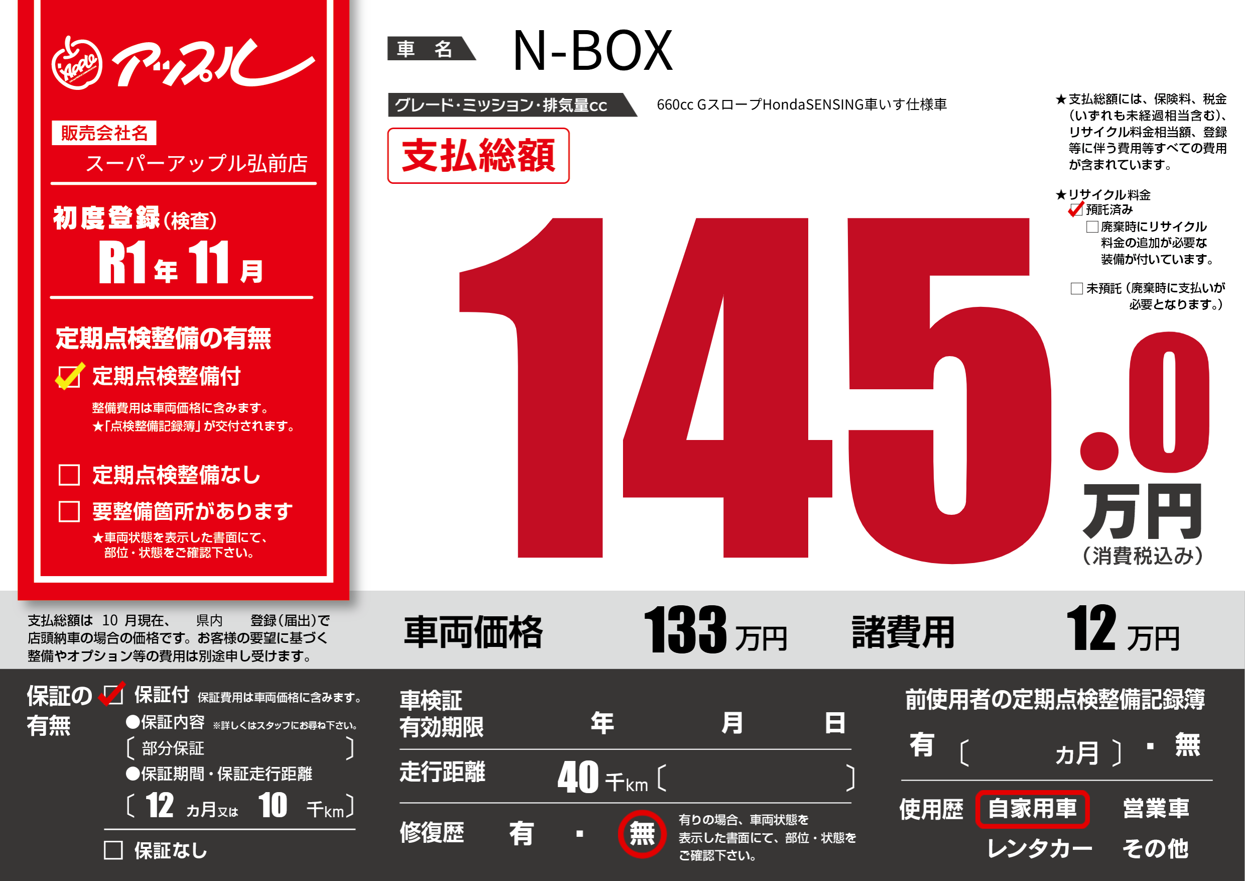 | 走行キロ | 4万km | 初年度登録 | R1年11月 |