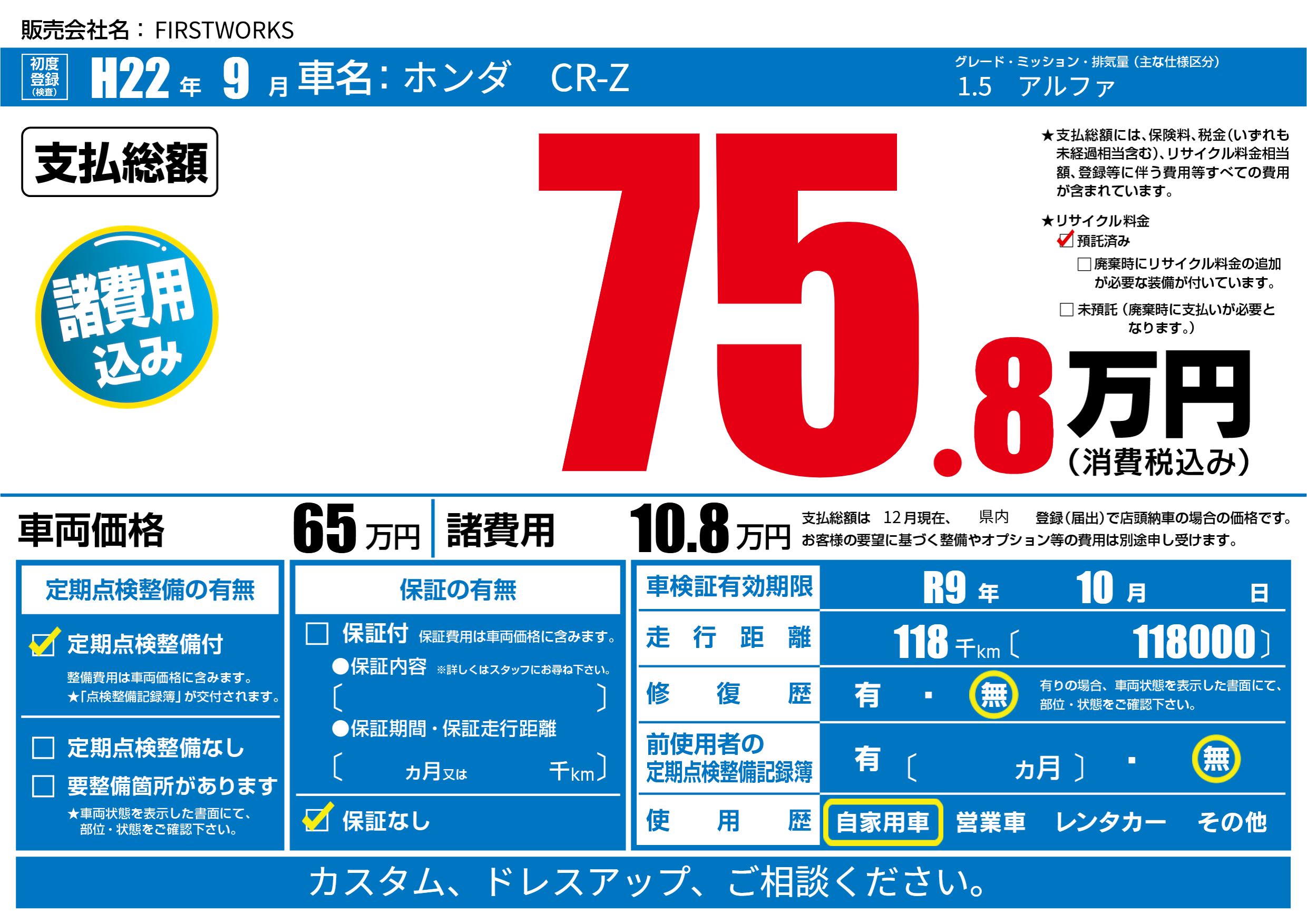 | 車検制限 | R9年 10月 - 日 | ||