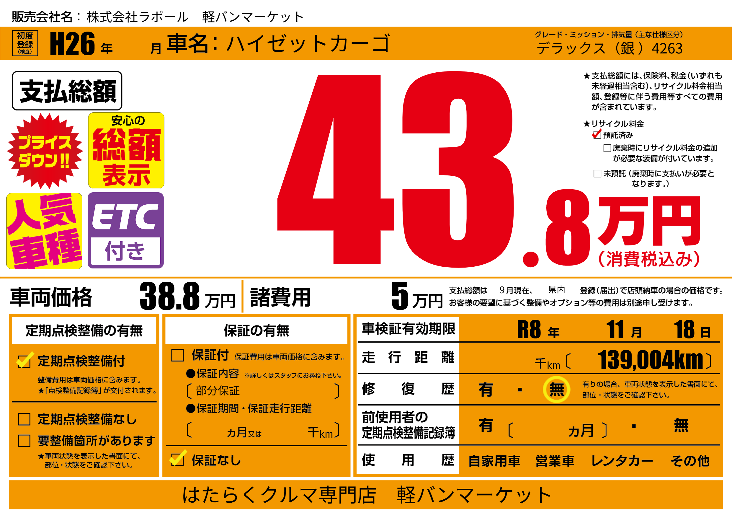 | 車名 | ハイゼットカーゴ | グレード ミッション 排気量 |