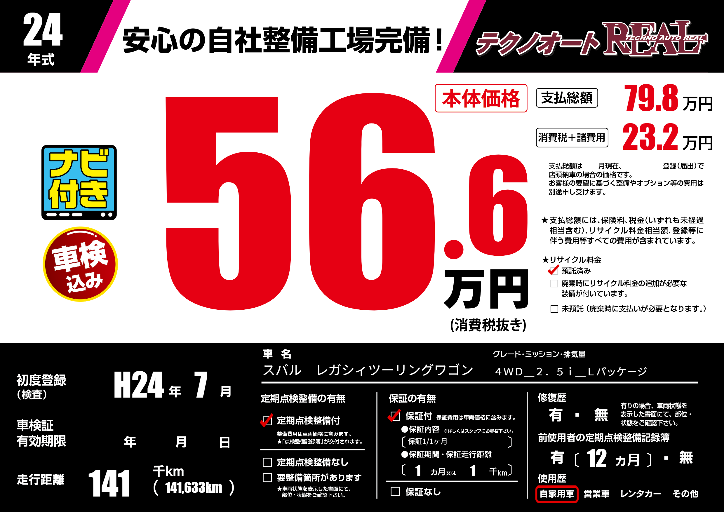 | 走行キロ | 14.1万km | 初年度登録 | H24年7月 |