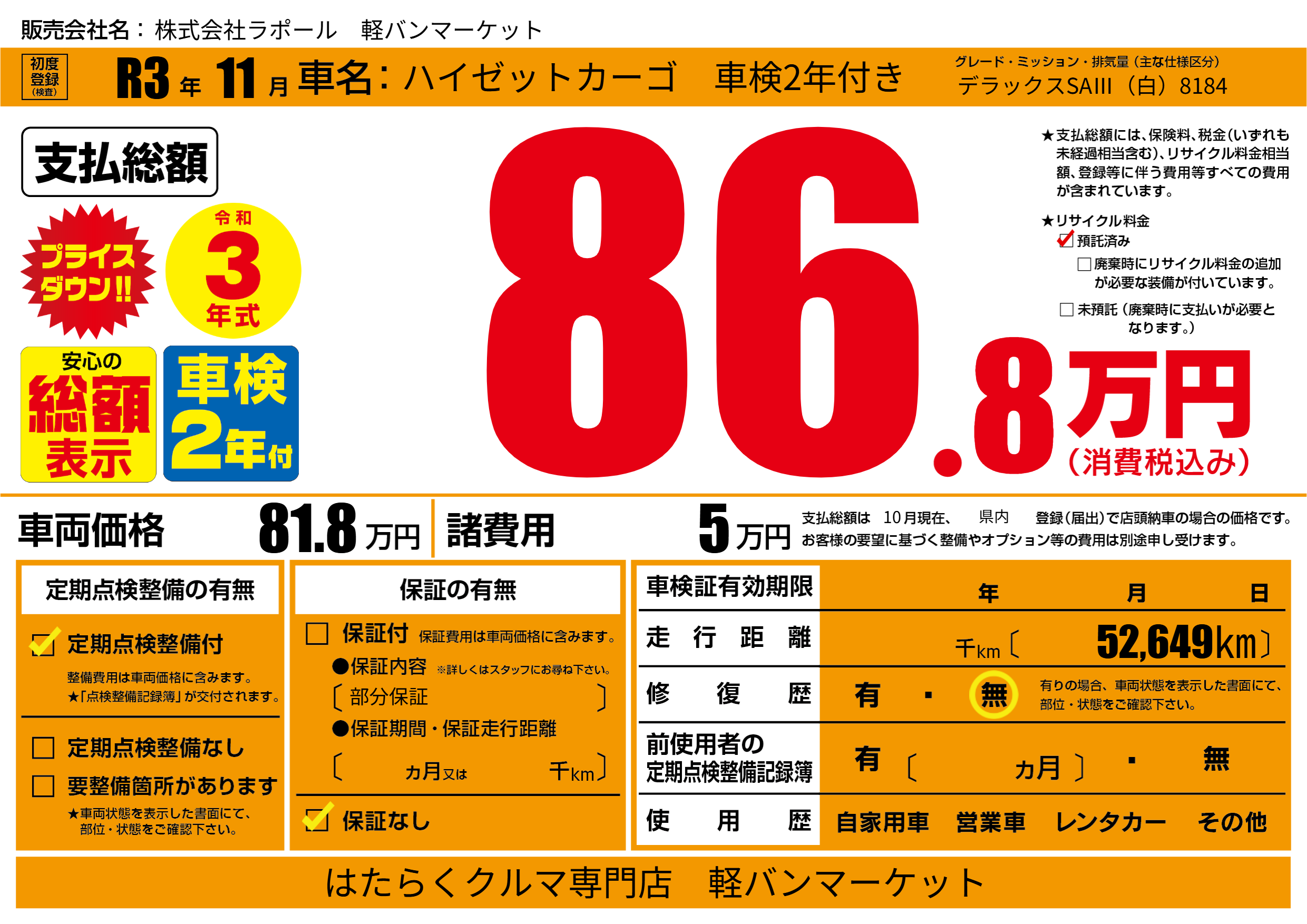 | 車名 | ハイゼットカーゴ 車検2年付き | グレード ミッション 排気量 |