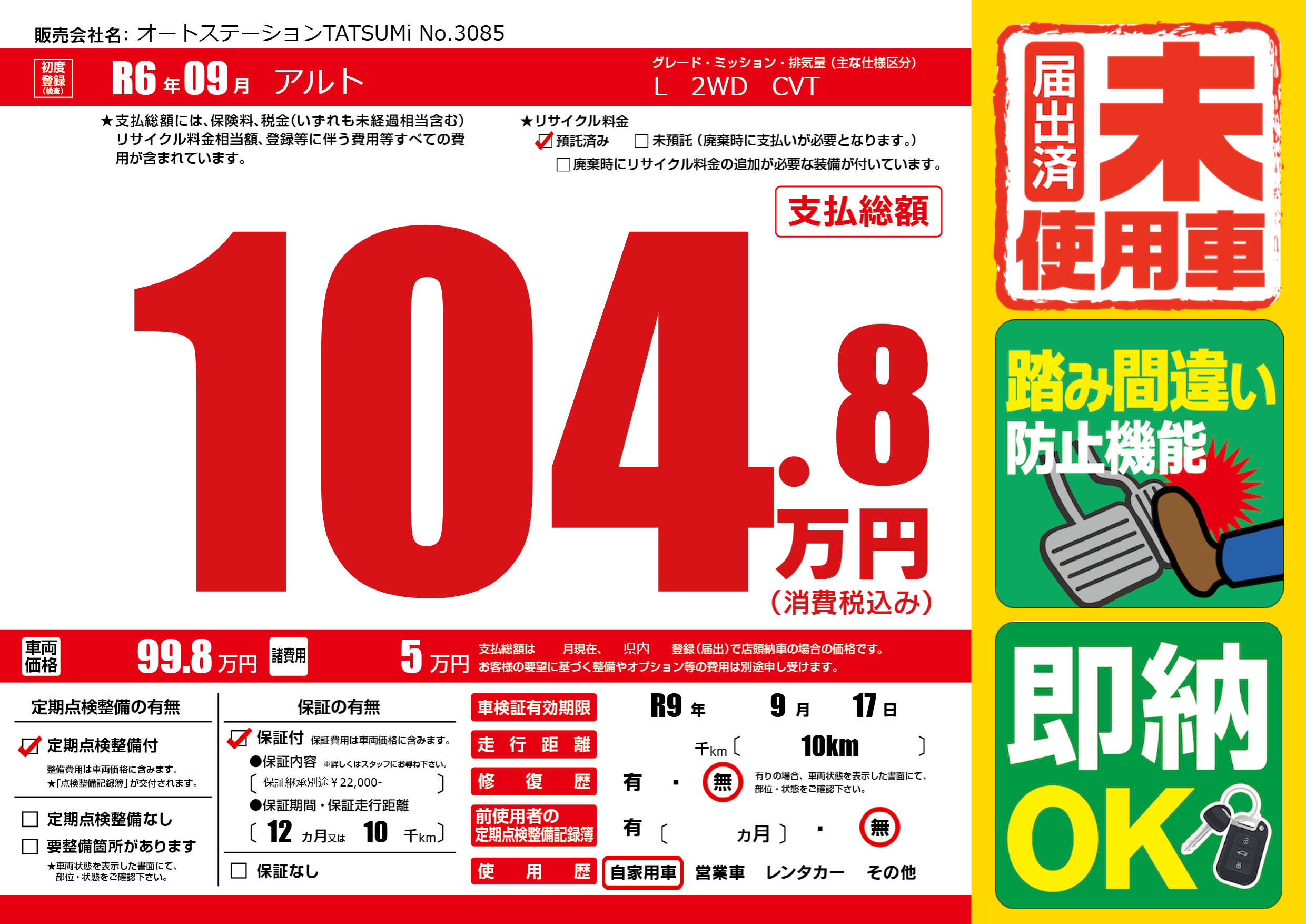 | 走行キロ | - | 初年度登録 | R6年09月 |
