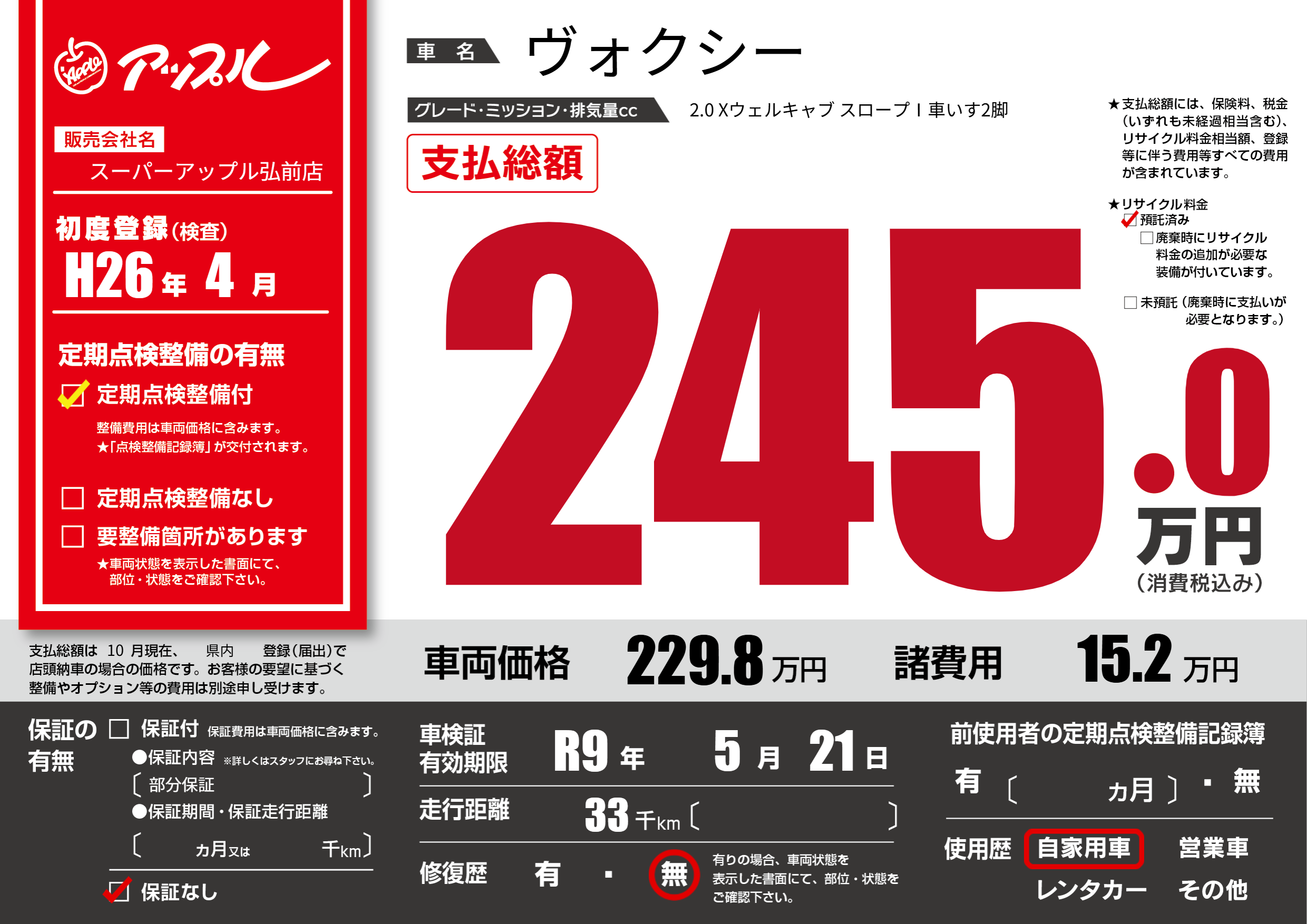 | 走行キロ | 3.3万km | 初年度登録 | H26年4月 |