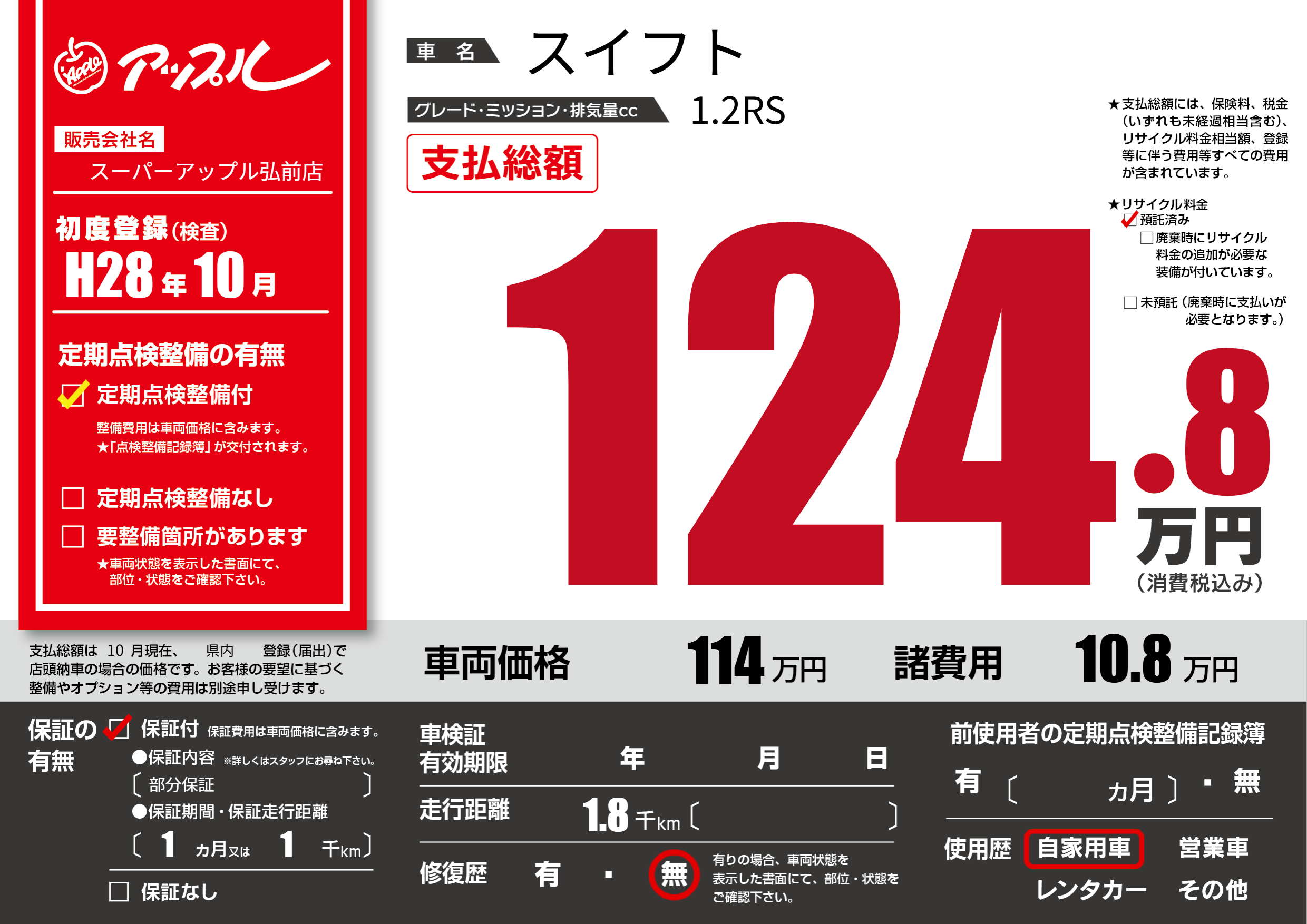 | 車名 | スイフト | グレード ミッション 排気量 |