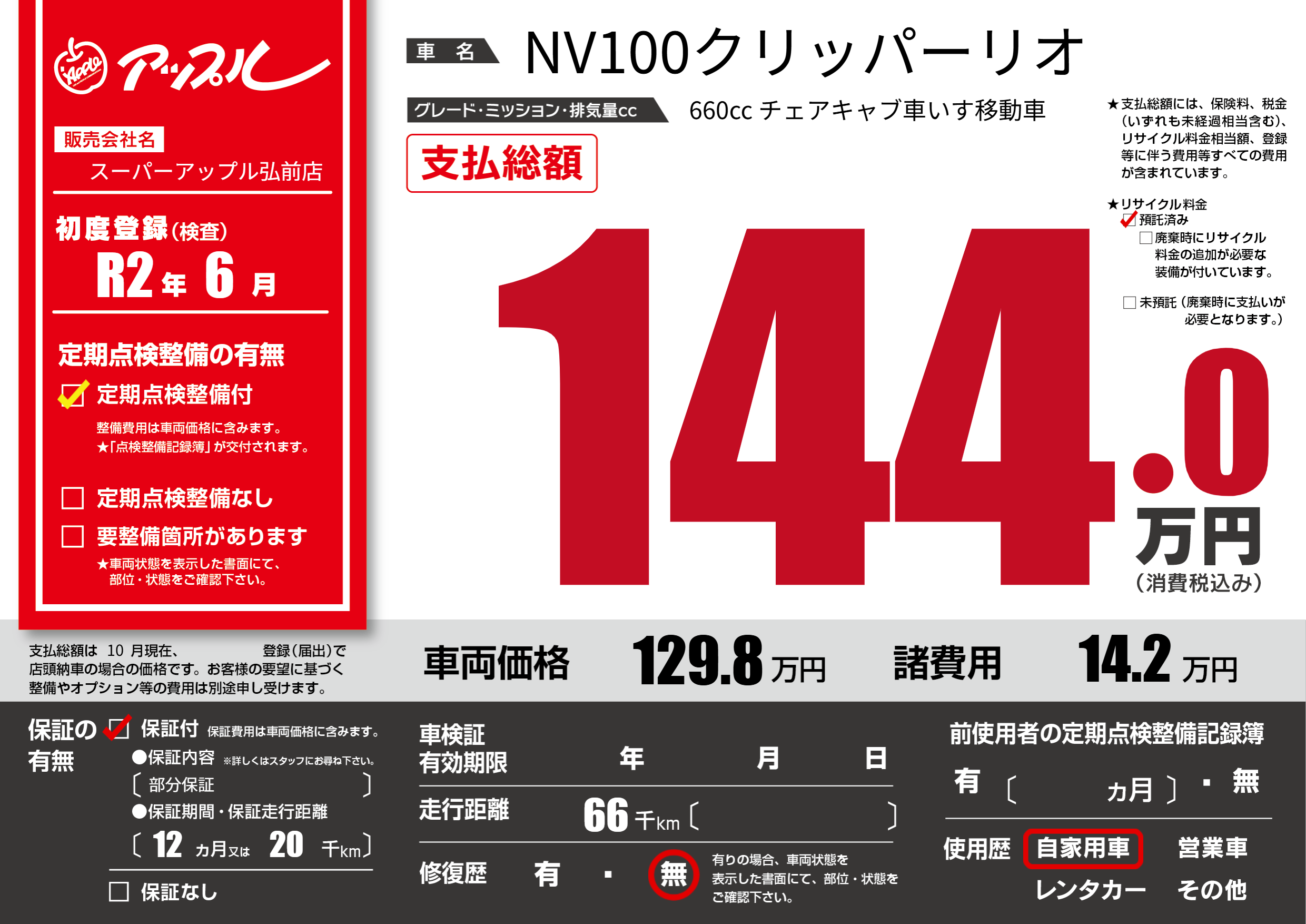保証付き 保証内容(部分保証) 12ヶ月または(20)千kmまで |