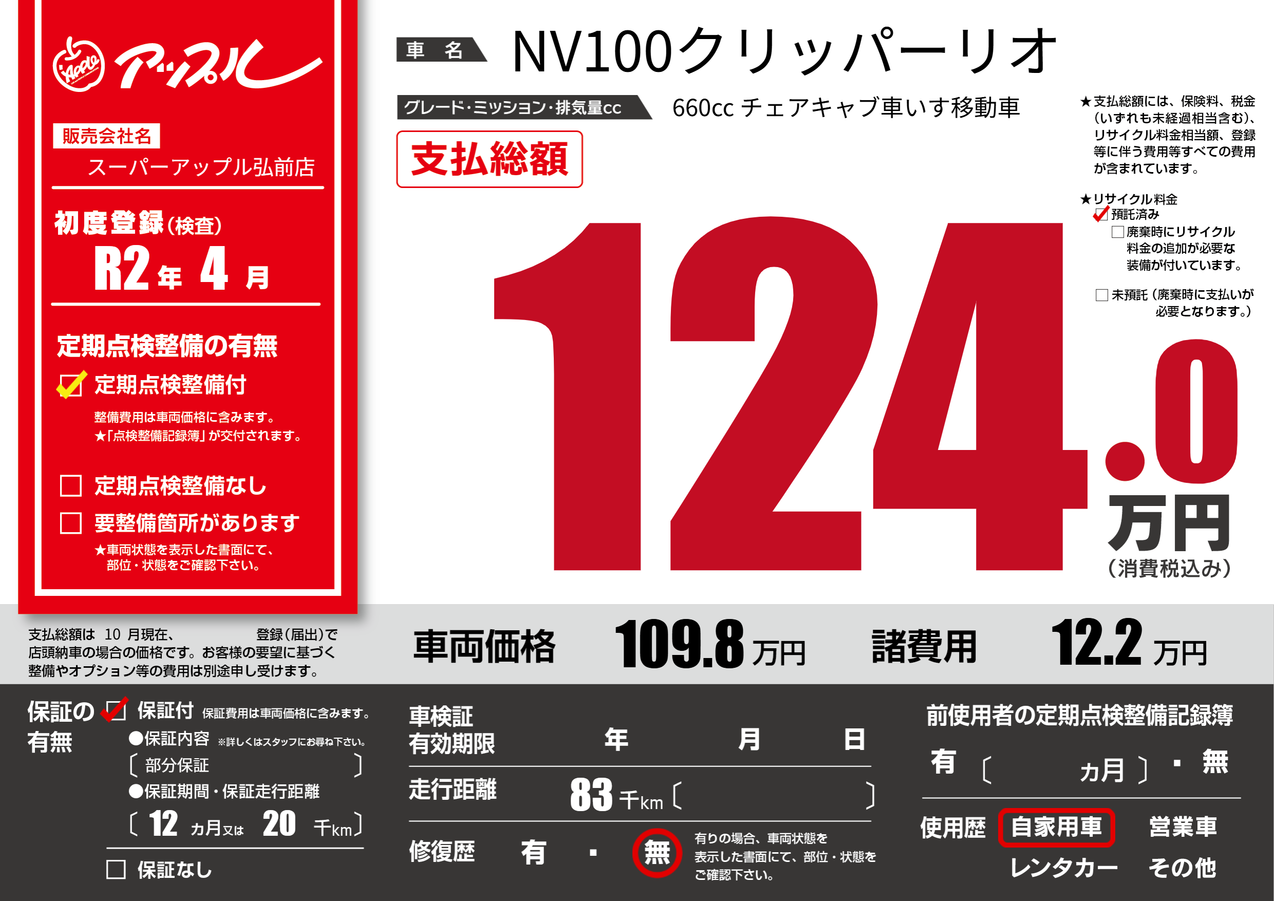 保証付き 保証内容(部分保証) 12ヶ月または(20)千kmまで |