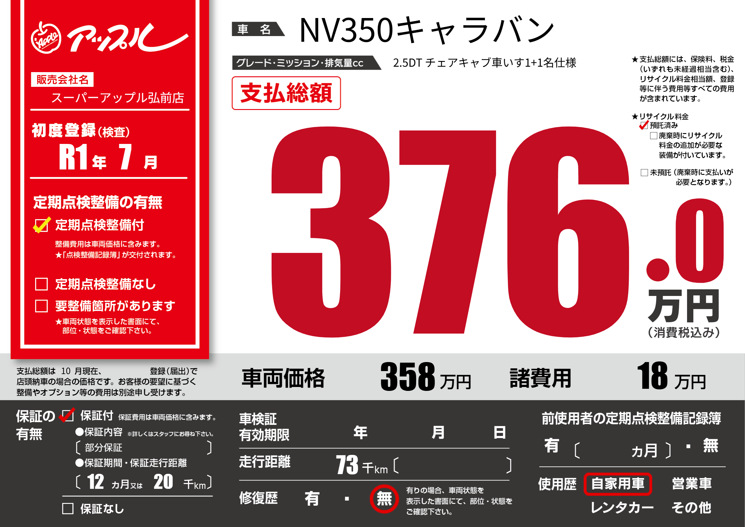 | 車名 | NV350キャラバン | グレード ミッション 排気量 |
