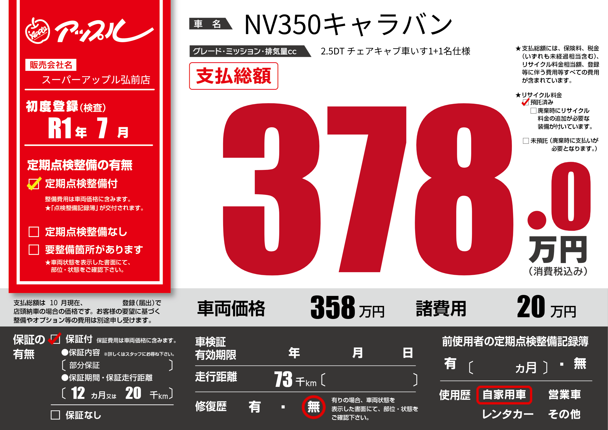 保証付き 保証内容(部分保証) 12ヶ月または(20)千kmまで |