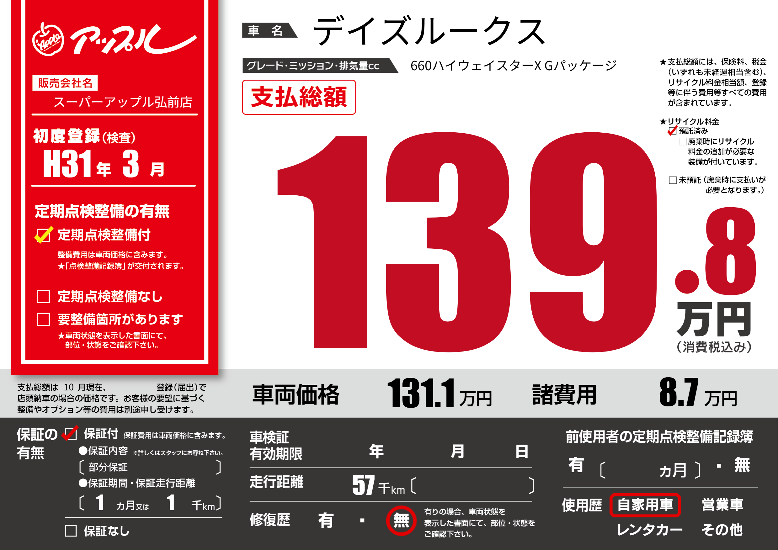 あり | リサイクル預託金相当額 | ( 0円)が別途必要 |