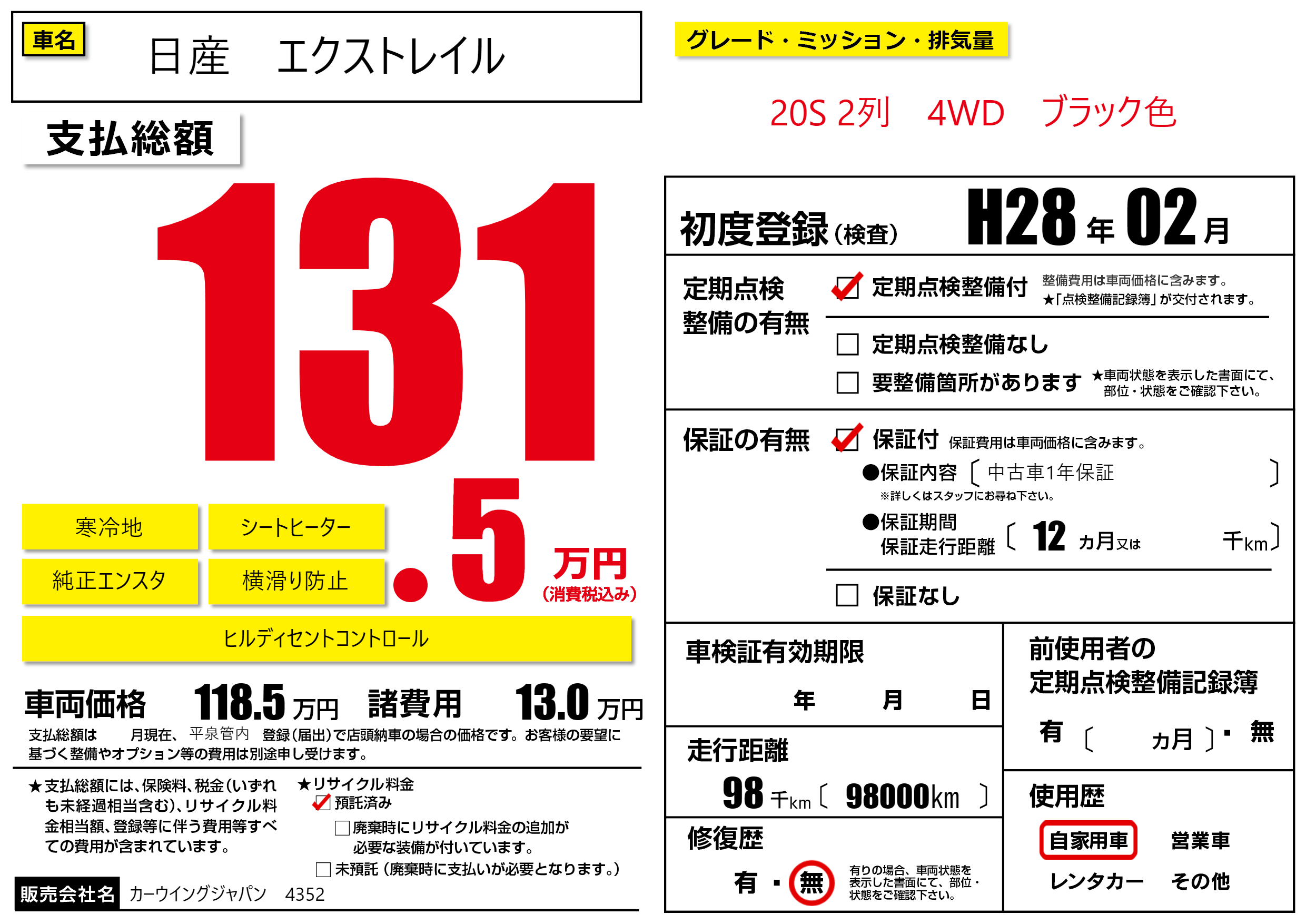 | 車名 | 日産 エクストレイル | グレード ミッション 排気量 |