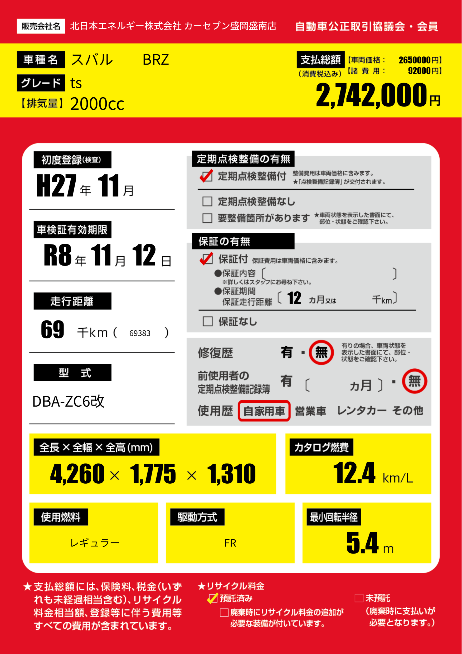 | 車名 | スバル BRZ | グレード ミッション 排気量 |