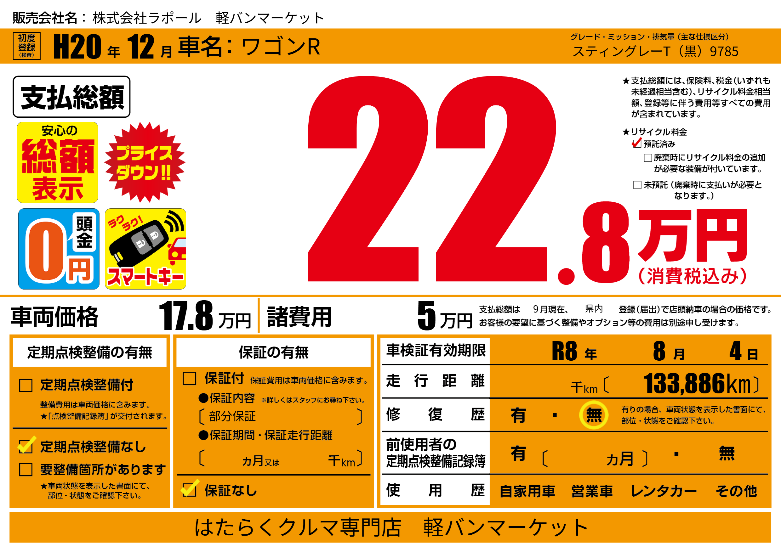 | 走行キロ | - | 初年度登録 | H20年12月 |
