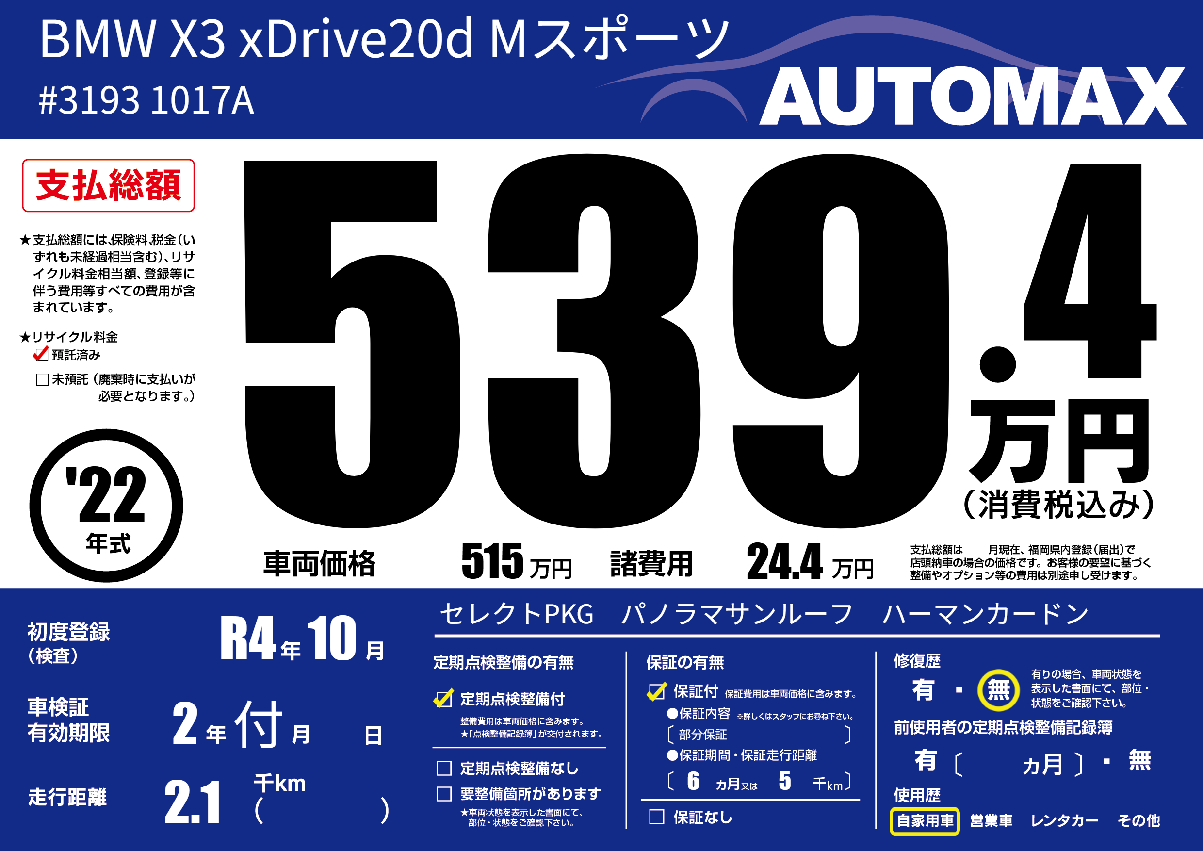 | 車名 | BMW X3 xDrive20d Mスポーツ | グレード ミッション 排気量 |