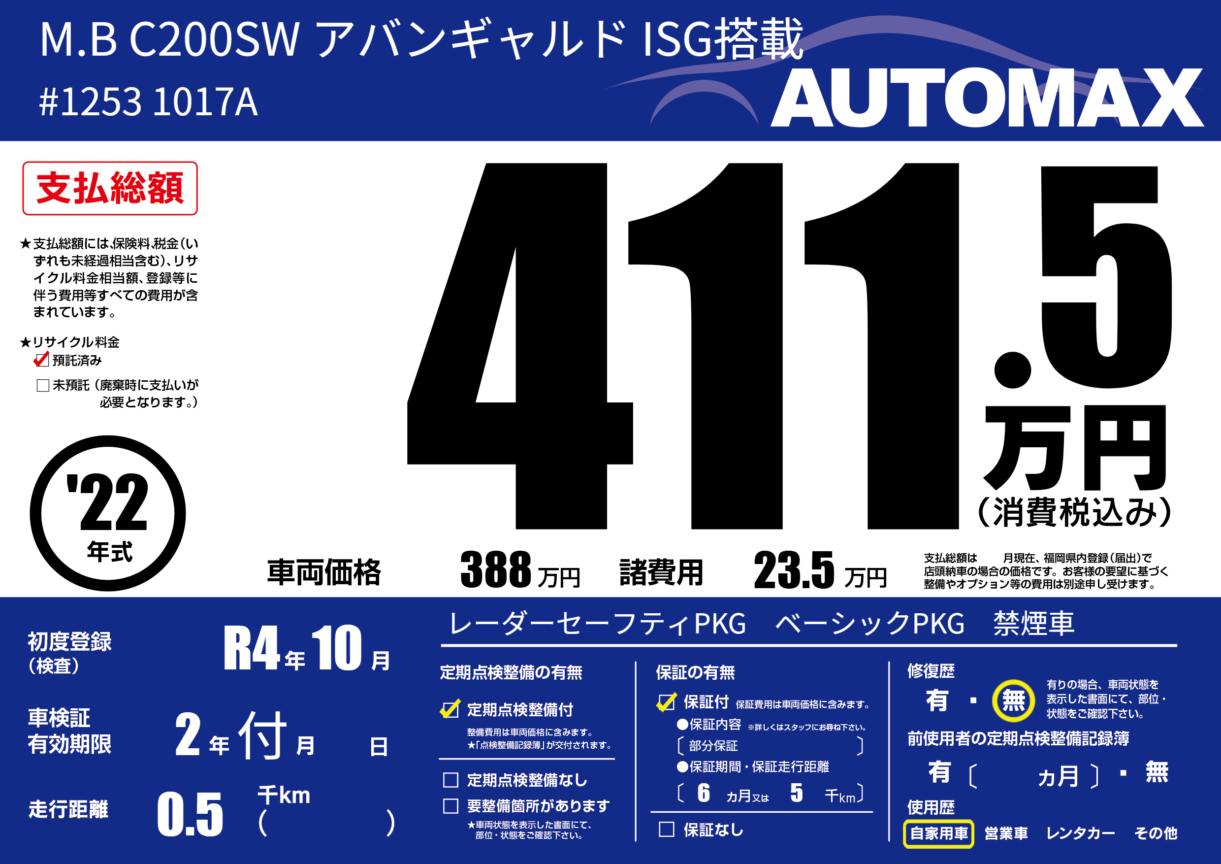 | 車名 | M.B C200SW アバンギャルド ISG搭載 | グレード ミッション 排気量 |