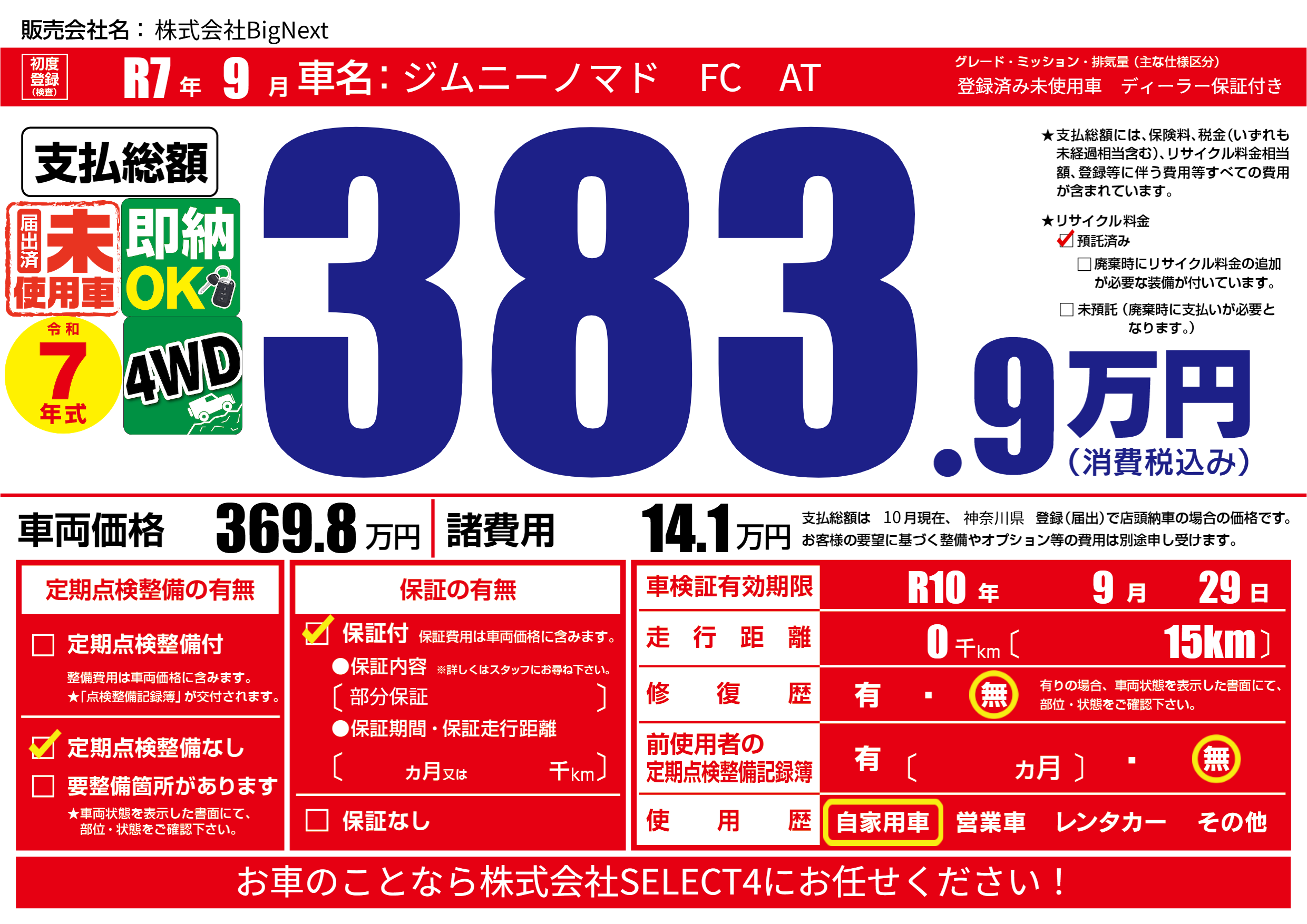 | 車名 | ジムニーノマド FC AT | グレード ミッション 排気量 |